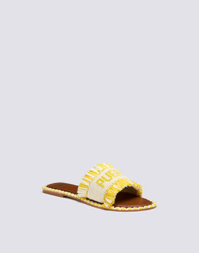 Bandeau slipper entirely embroidered with glass beads and edged with colored raffia fringes. The sole is in real leather with a gold-colored embossed logo, also profiled by handcrafted raffia embroidery.