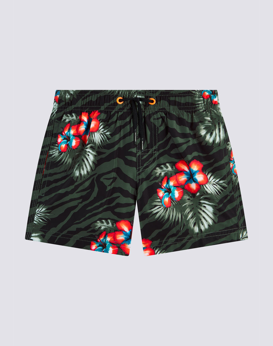 Swim trunks with elasticated drawstring waistband, in lightweight recycled repreve® fabric made of plastic bottles. Iconic rainbow detail on the back. Jungle Hibi print.