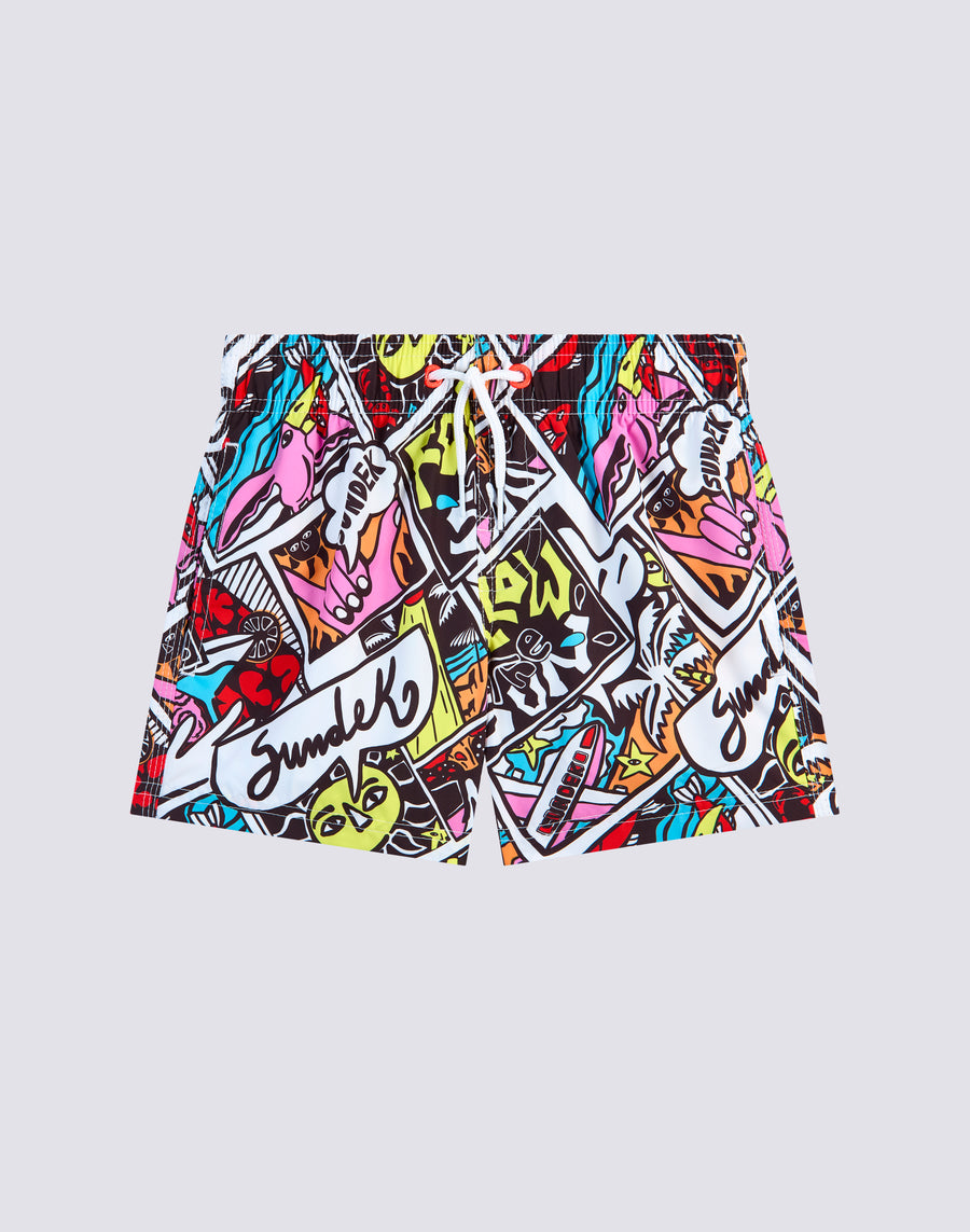 Swimshorts with elasticated drawstring waist, in lightweight Repreve® fabric recycled from plastic bottles. With Cartoon print and the traditional Sundek rainbow on the back. Outer thigh length 10.25"/26 cm (in size 6 years).