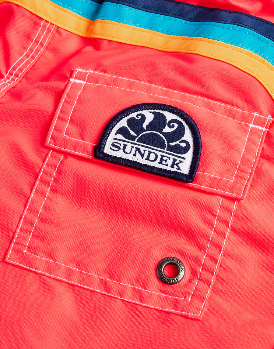 Intense color and hyper-comfortable, quick-drying fabric for these boys' swim shorts. A model that will accompany your child in his thousand holiday activities, perfect for moving and playing in complete freedom. it's made from our heritage nylon-taffeta fabric and constructed with three-needle stitching that makes it durable over time. To pack in your suitcase, year after year.