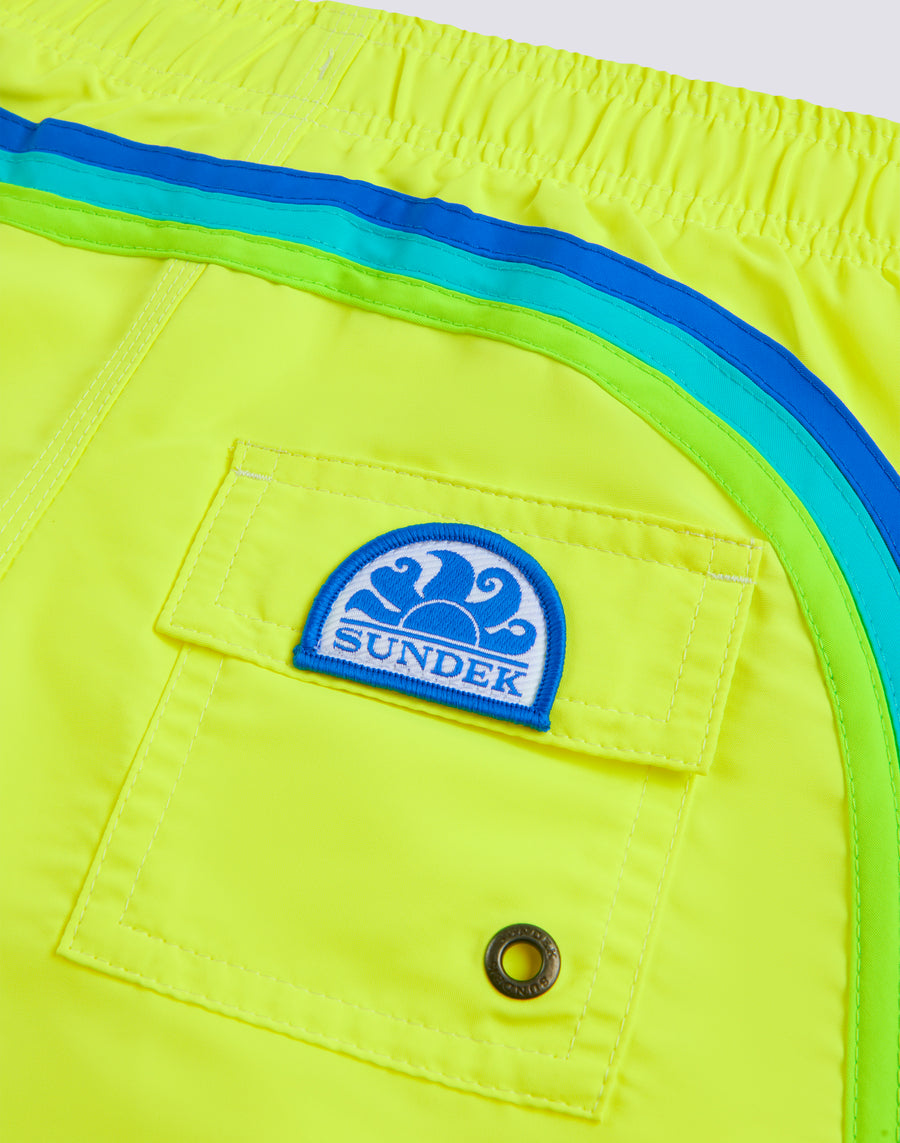 Intense colour and ultra-comfortable, quick-drying fabric for these children's beach shorts. A model that will accompany your child in his many activities on holiday, perfect for moving around and playing in complete freedom. It is made of our historical nylon-taffeta fabric and constructed with three-needle stitching that makes it durable. To pack year after year.