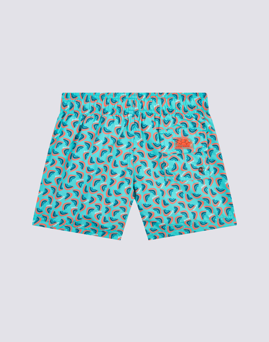 Get ready to ride the next wave with these short men's swim shorts with elasticated waist and rainbow print. Made of lightweight recycled polyester, they guarantee a snug fit and comfort thanks to the drawstring and elasticated waist. Length: 10.25"/26 cm (size 6 years).