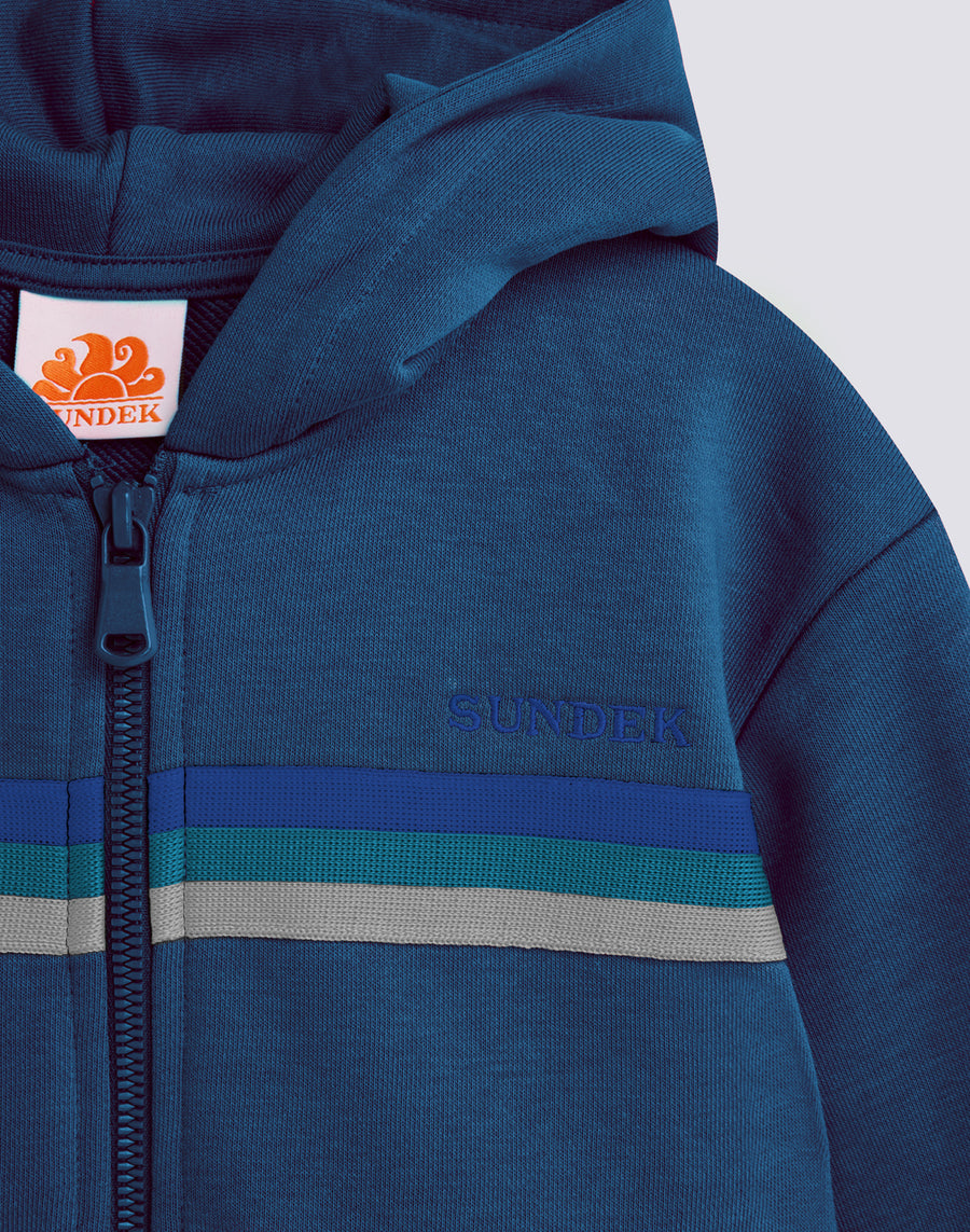 Boy's hooded sweatshirt with full central zip and rainbow tricolour detail. To be combined with the matching sweatpants for a super cool look.