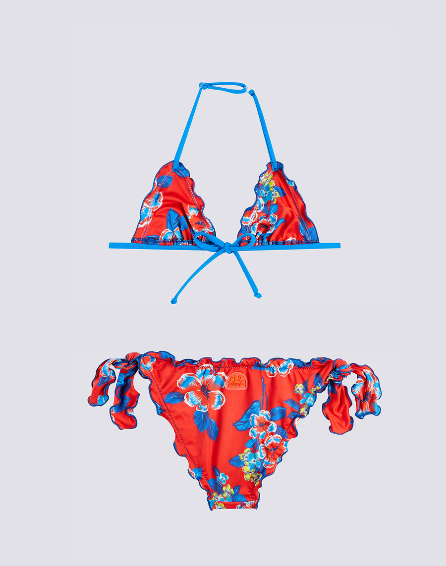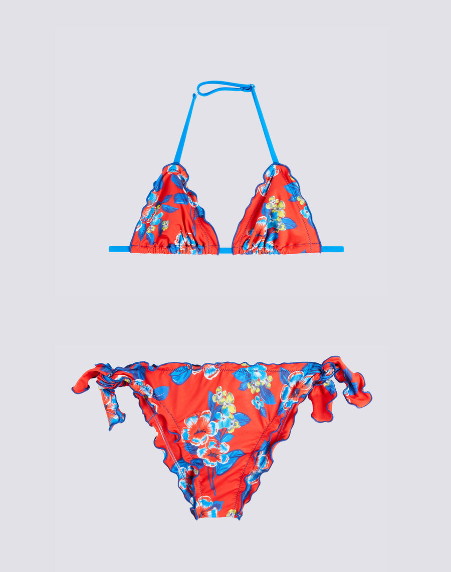 Girl's bikini with triangle top and briefs with adjustable ties, colourful floral pattern. Same model available for mum, in adult sizes.