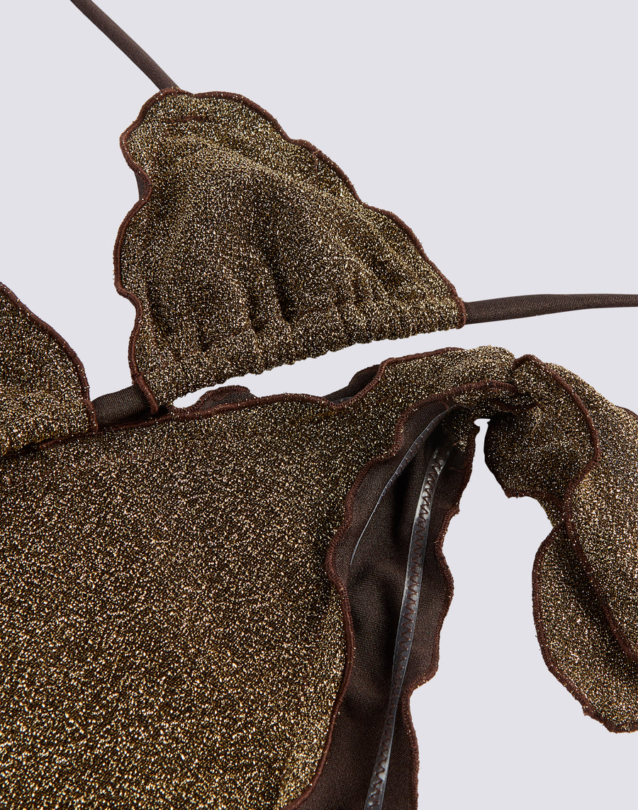 64% PA 36% EA Shiny lurex fabric, comfortable and with lining that guarantees a soft contact with the skin.