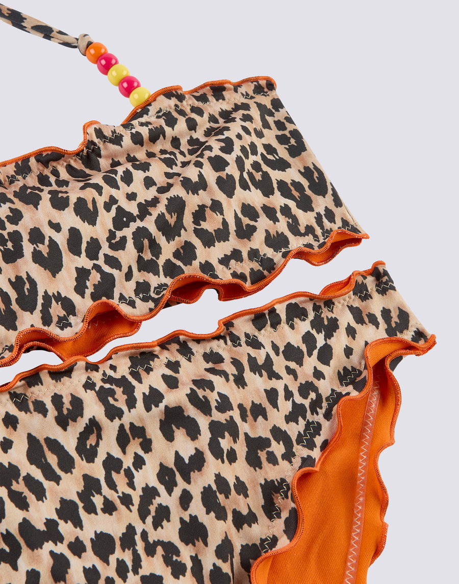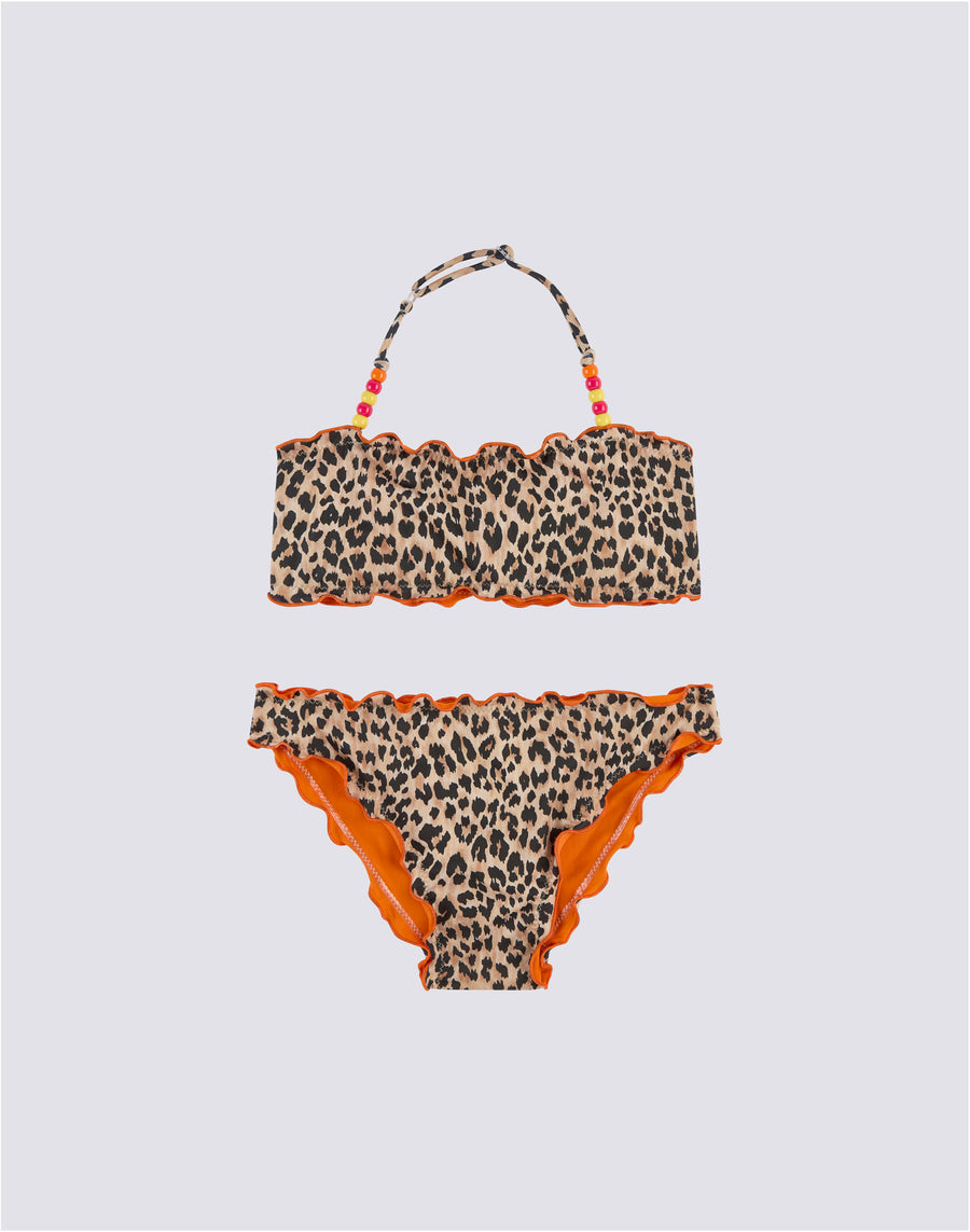 Girl's mini bikini in Sweet Leopard print consisting of a gathered fixed-waist bottom and bandeau top, also gathered, with multicoloured beads.