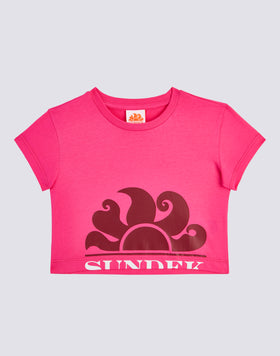 Cropped girl's T-shirt to wear over jeans or skirts. An essential model for your little girl's wardrobe
