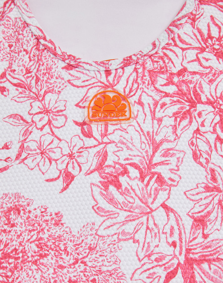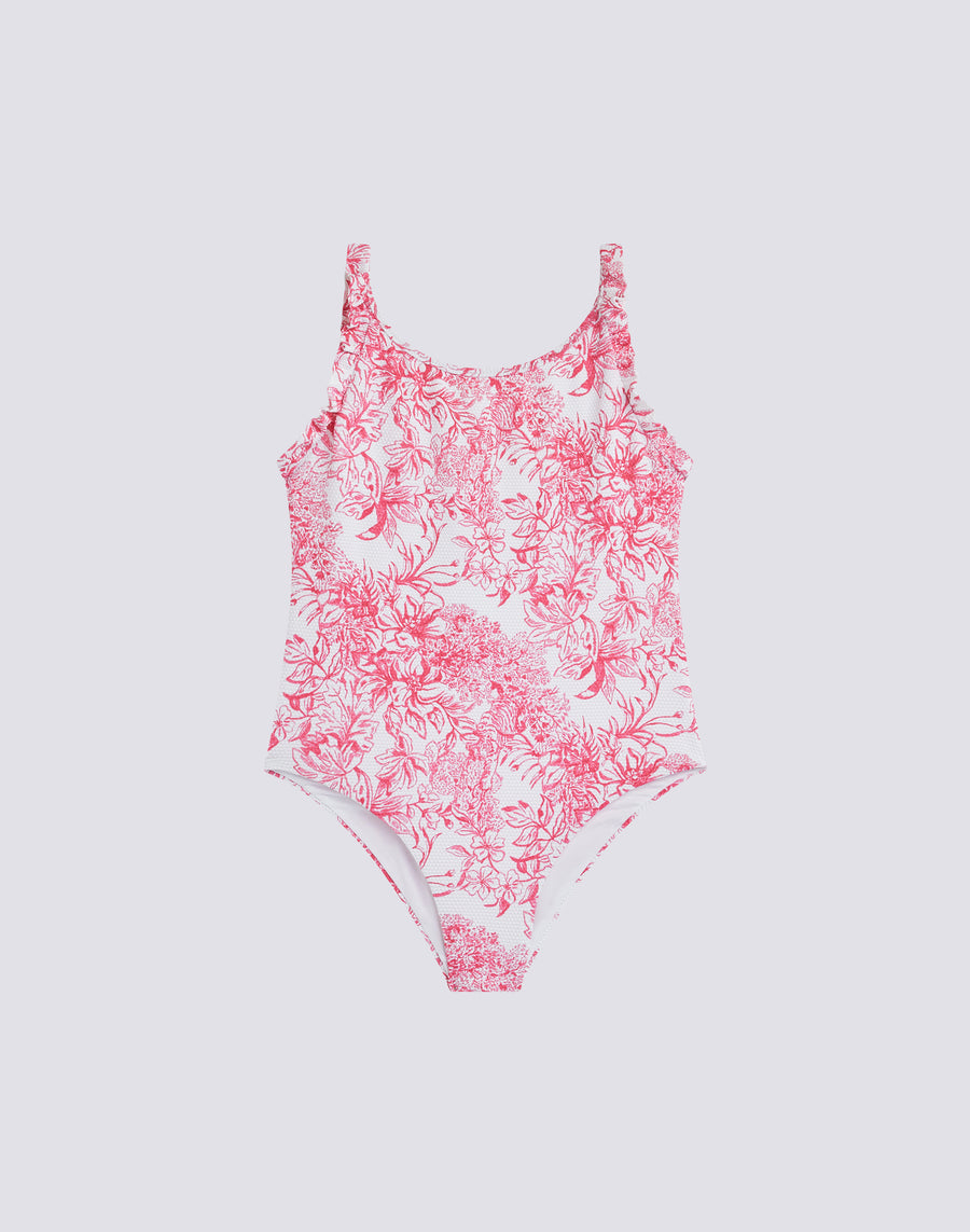 Romantic one-piece swimming costume for girls with Fleur de Joie print. Match the same model in the adult version for matchy matchy beach looks.