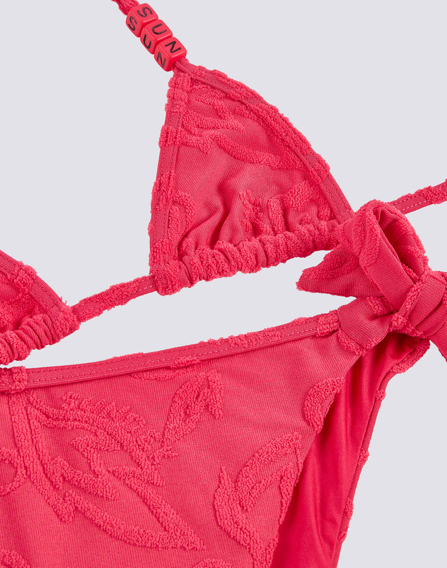 Jacquard terry mini bikini with SK23 pattern consisting of triangle with adjustable ties and briefs with bows, also adjustable.