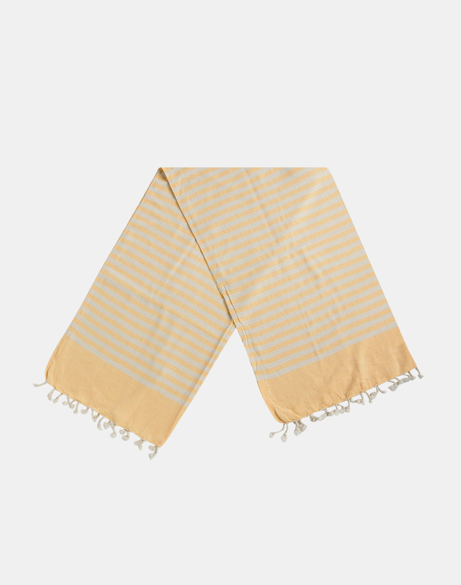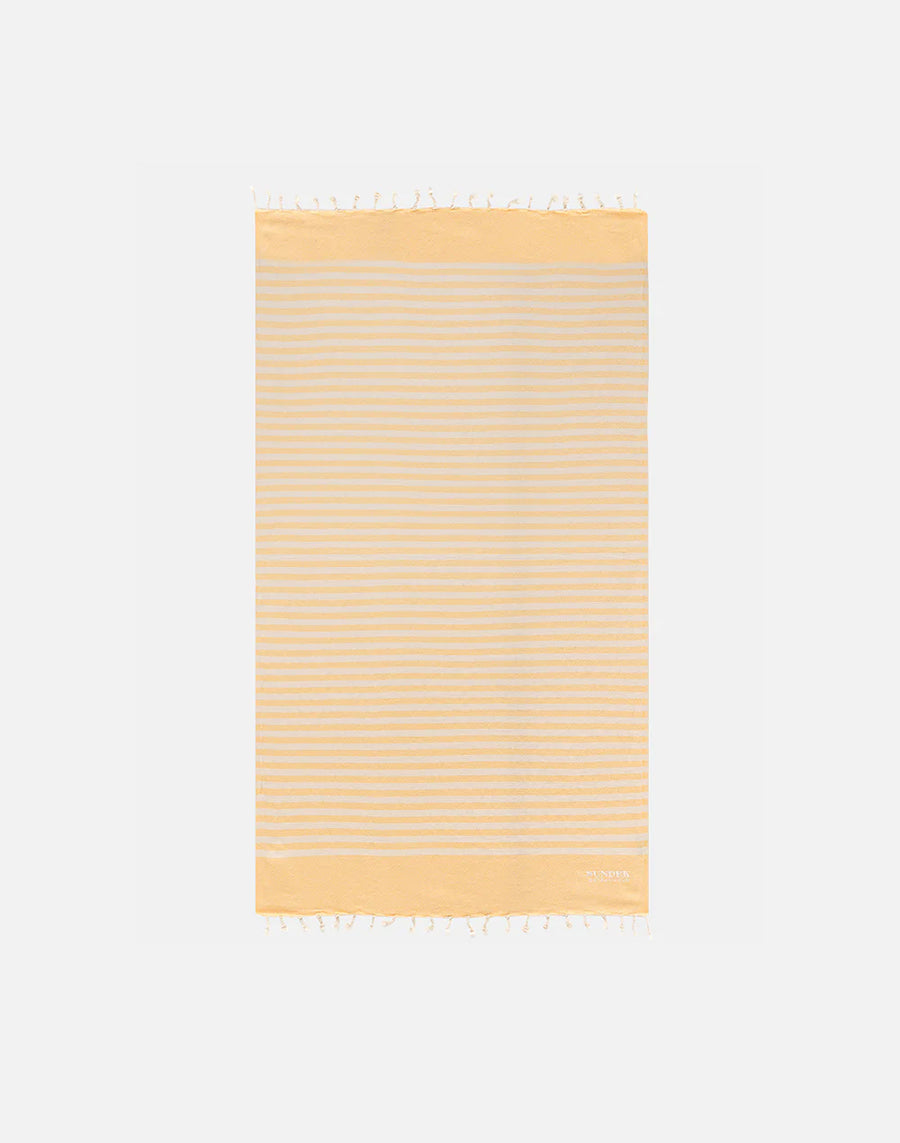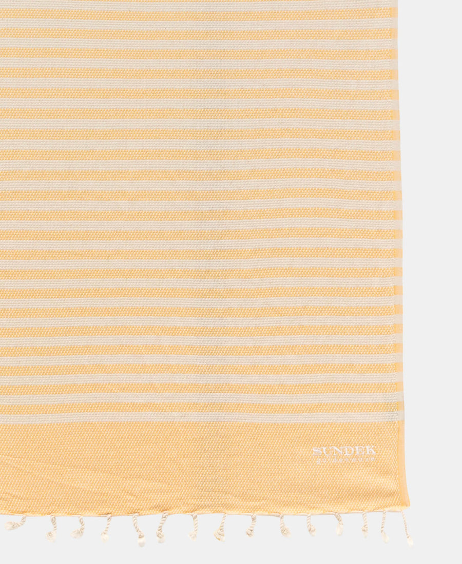 Striped jacquard fouta towel in a honeycomb weave with a contrasting embroidered Sundek Goldenwave logo and braided fringed ends.