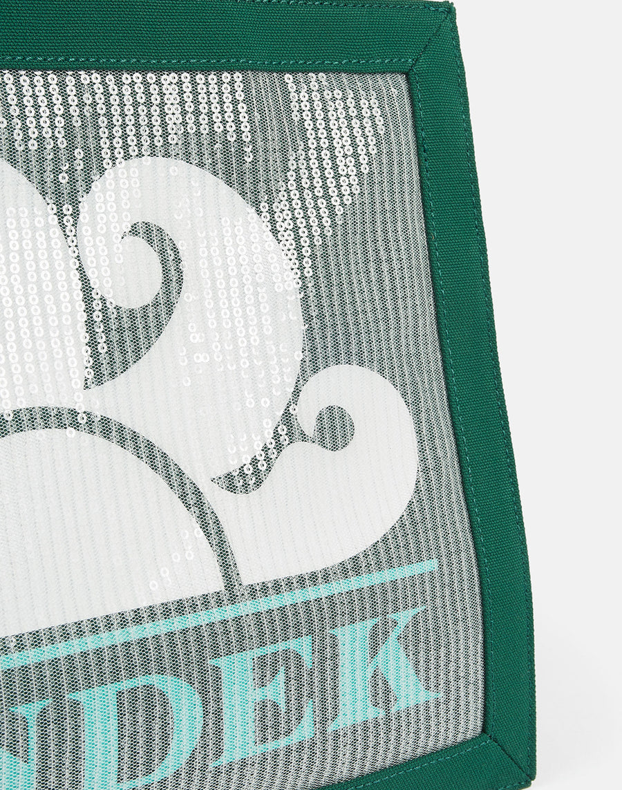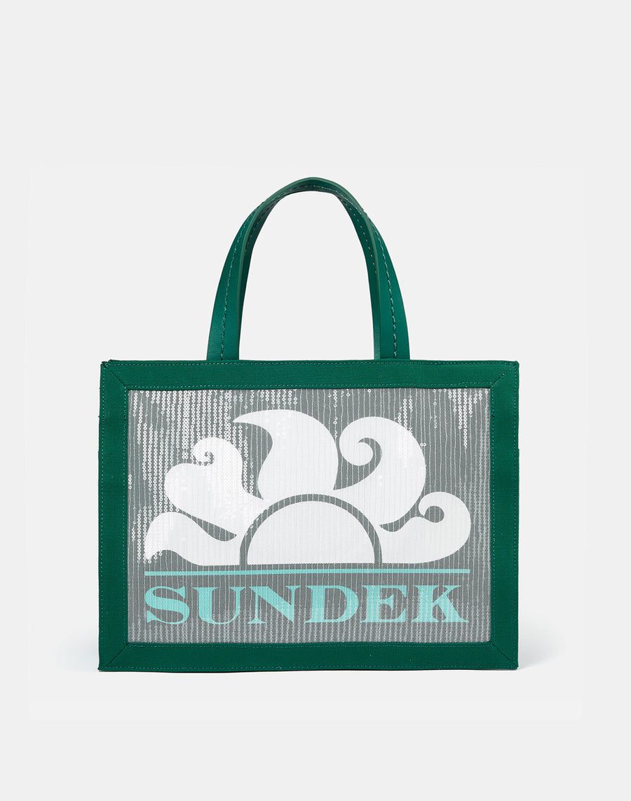 Medium mesh bag with sequinned details and a printed Sundek logo. This bag is perfect for the beach thanks to its fine mesh, designed to prevent sand from getting in. Appliquéd surfboard charm.