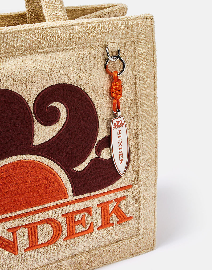 Towelling beach bag with an embroidered logo. Iconic surfboard charm