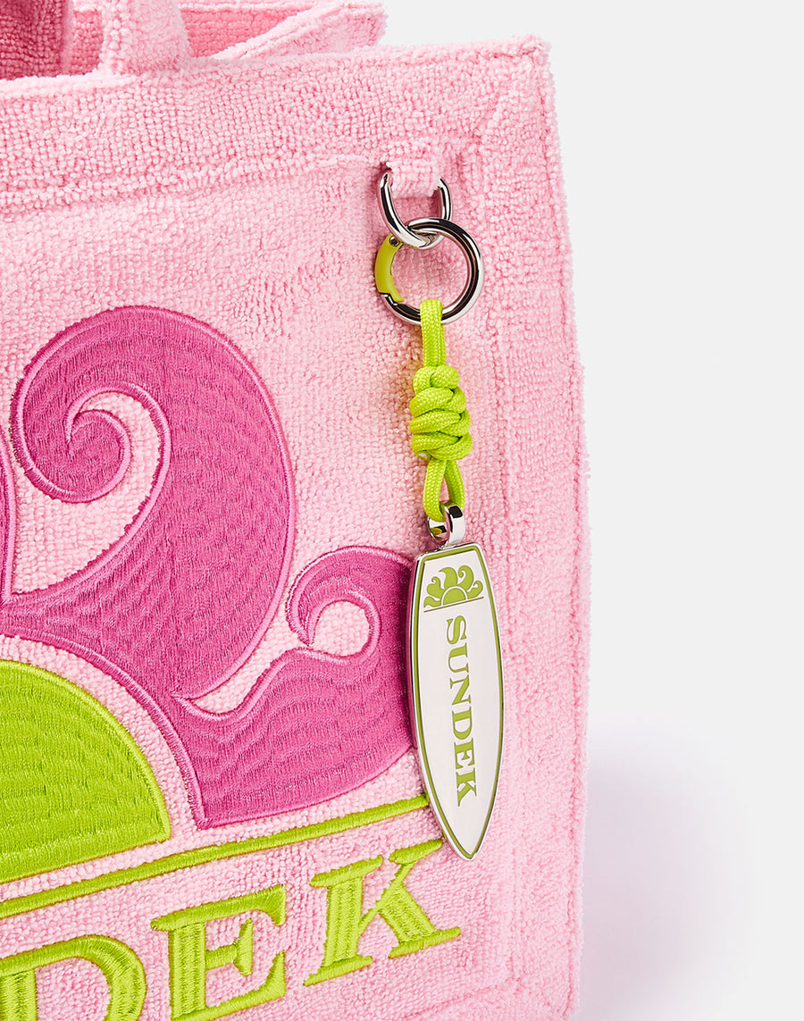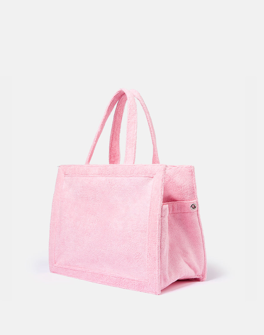 Medium towelling beach handbag with an embroidered logo. Iconic surfboard charm.