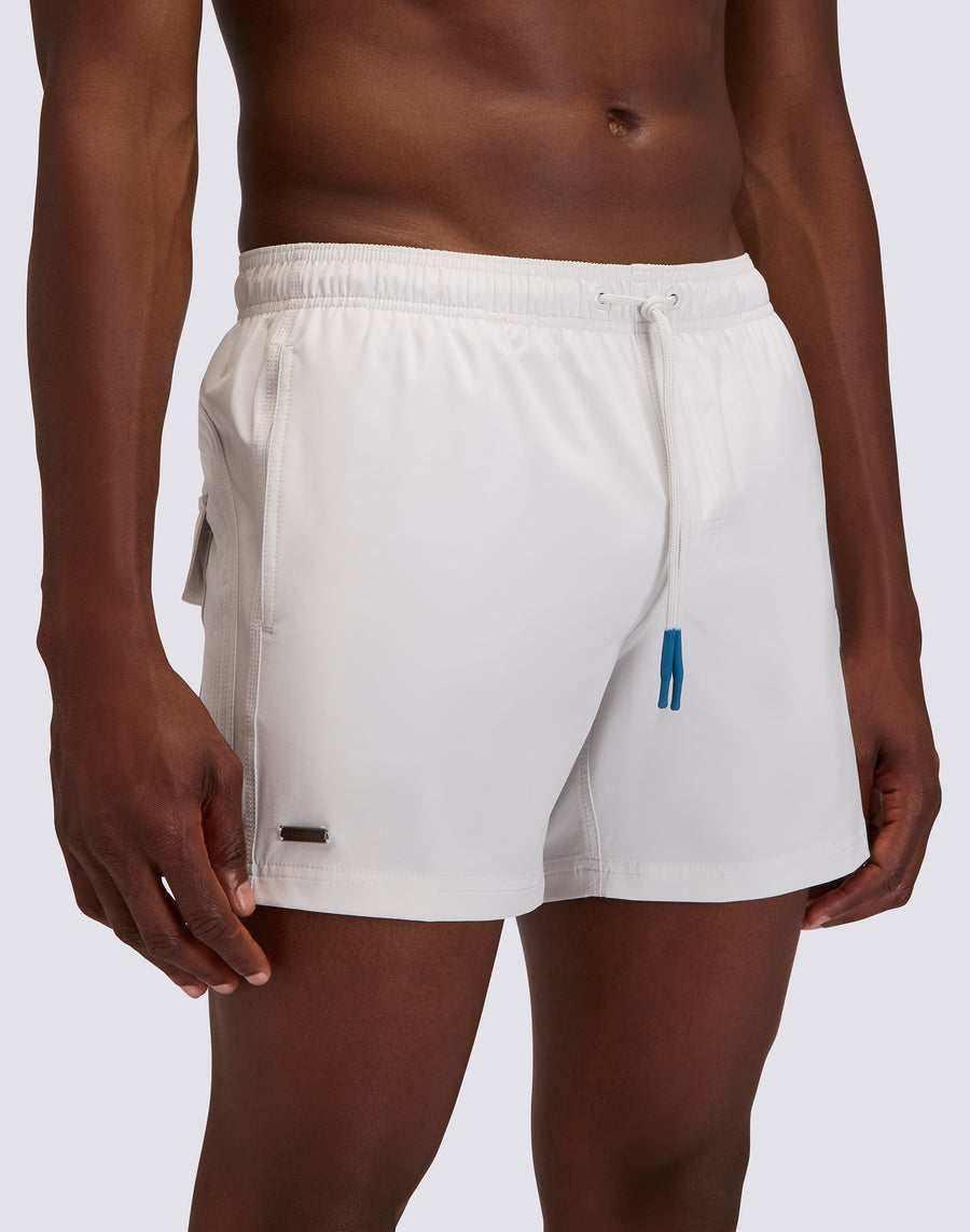 Get ready to catch the next wave in the Goldenwave solid elastic-waist short swimsuit in 4Way Stretch fabric . This solid color features a tonal rainbow print on the back and a contrasting logo pocket with Velcro closure. The elastic waistband offers optimal comfort and a drawstring closure for a custom fit.