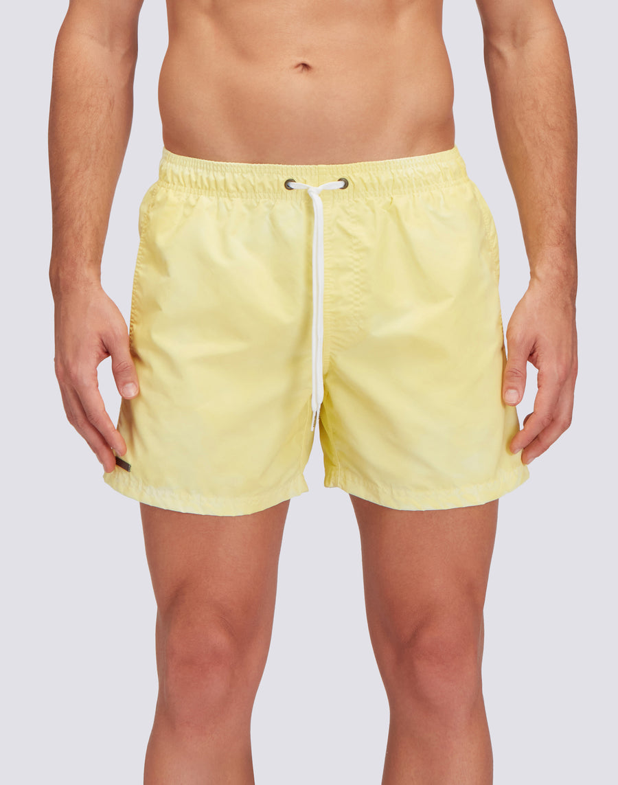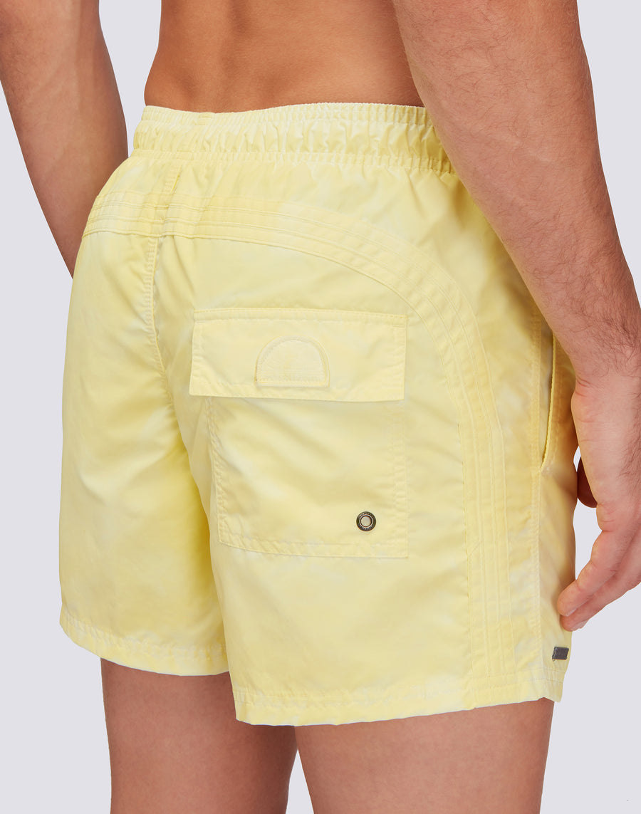 Get ready to ride the next wave with Goldenwave's elasticized waist short swimming costume, treated and dyed with artisanal techniques. The historical nylon taffeta fabric and the construction of the model make it fast drying and super resistant season after season. The special processing gives each garment extreme originality.