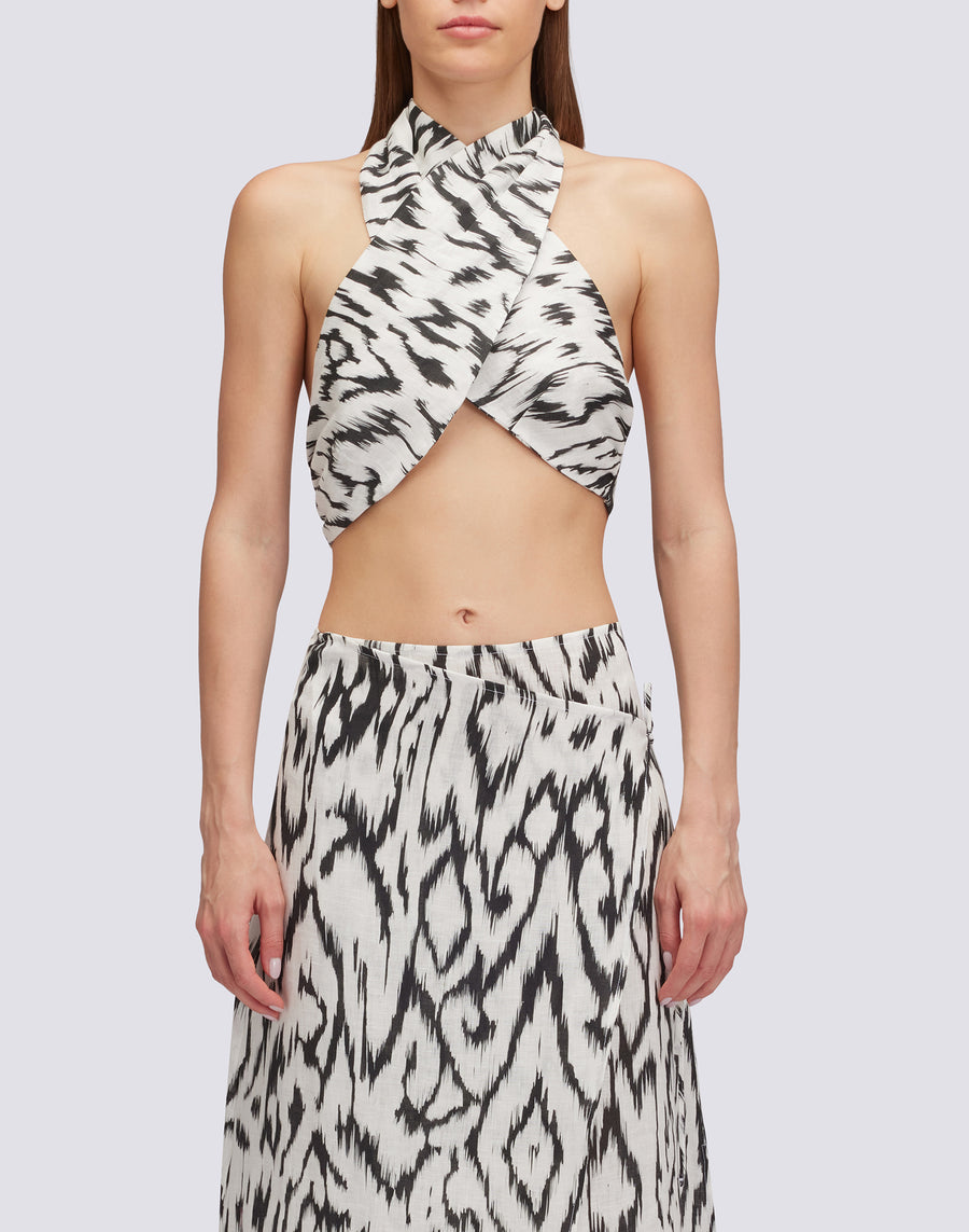 Cropped linen top criss-crossed at the front with a knot fastening at the back of the neck. Particular, suitable for those who want to create a more jaunty and original look.