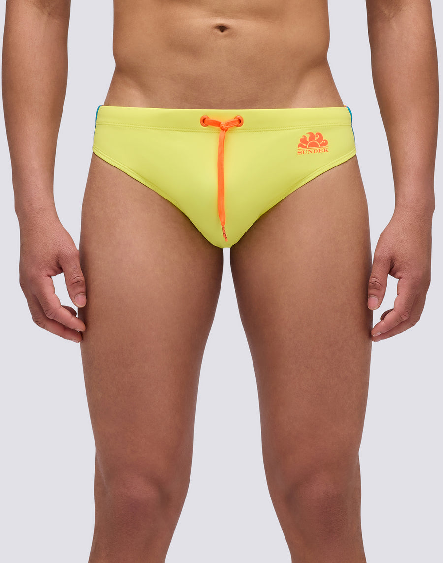 Solid color men's swimsuit briefs with adjustable waist. The monochrome swim briefs with drawstring and three contrasting colored side bands for a strong and functional look. It dries quickly and gives you comfort and durability in and out of the water: wear it for swimming and training and when you rest and sunbathe.