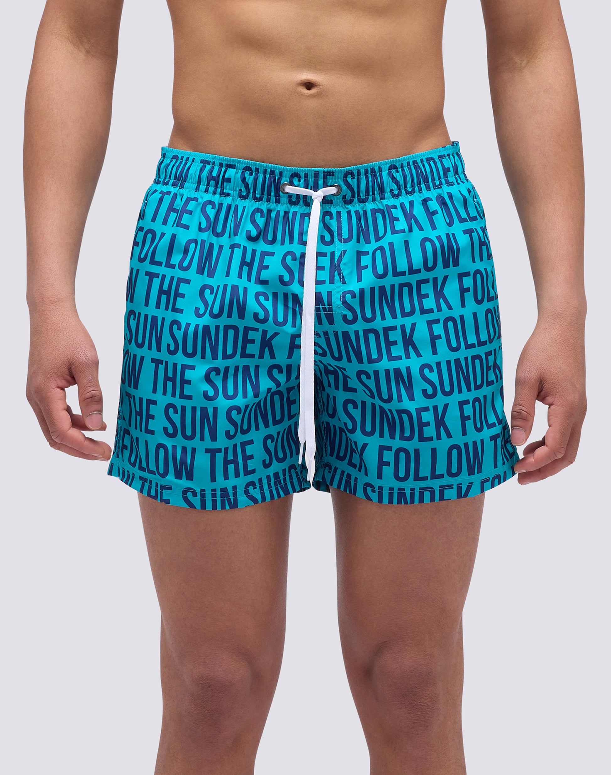 Men's shorts in lightweight, quick-drying Polyester fabric. Iconic Sundek rainbow detail on the back and print. Outer thigh length 14”/35 CM (in size M).