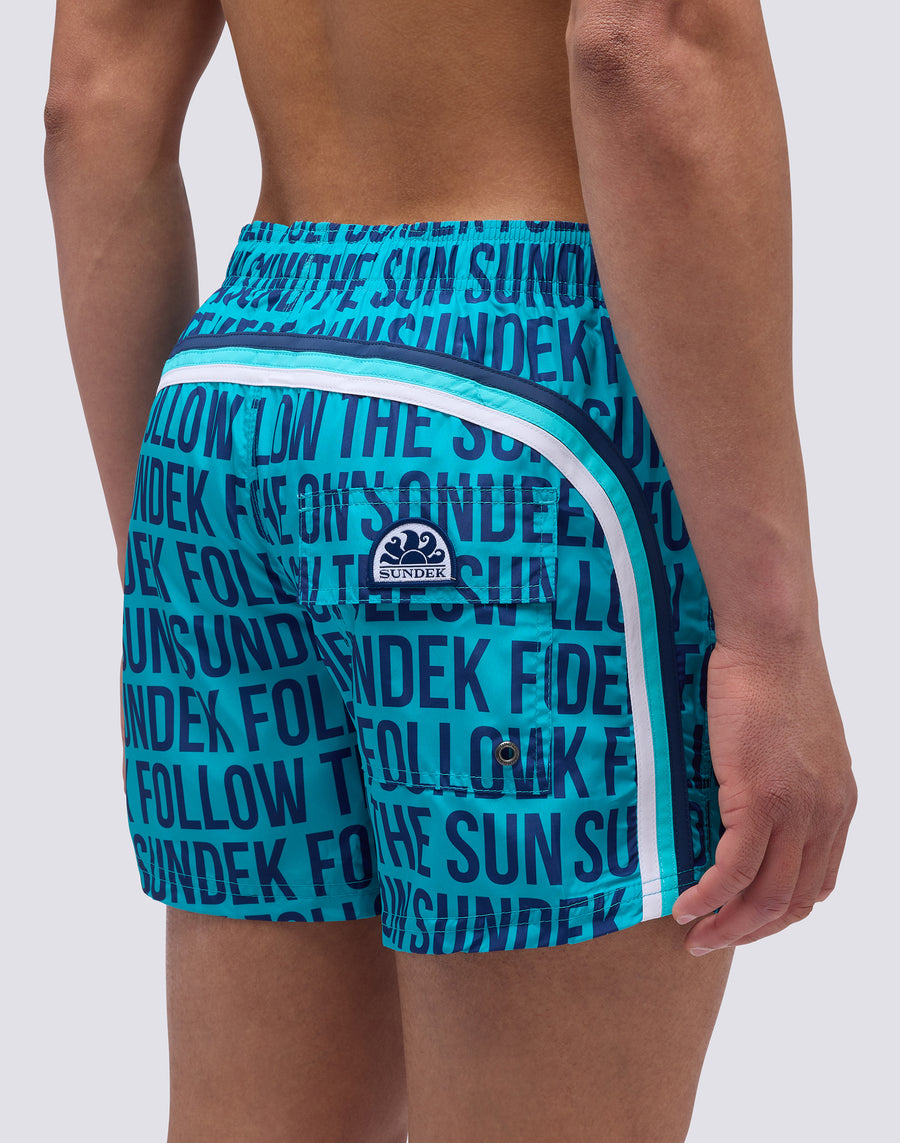 SHORT SWIMSUIT WITH ELASTIC WAIST AND PAYOFF WRITINGS PRINT