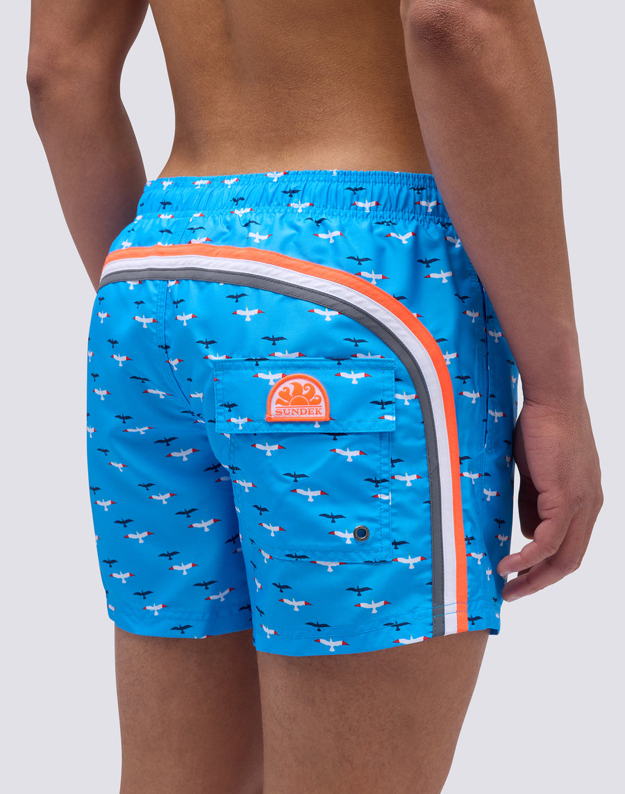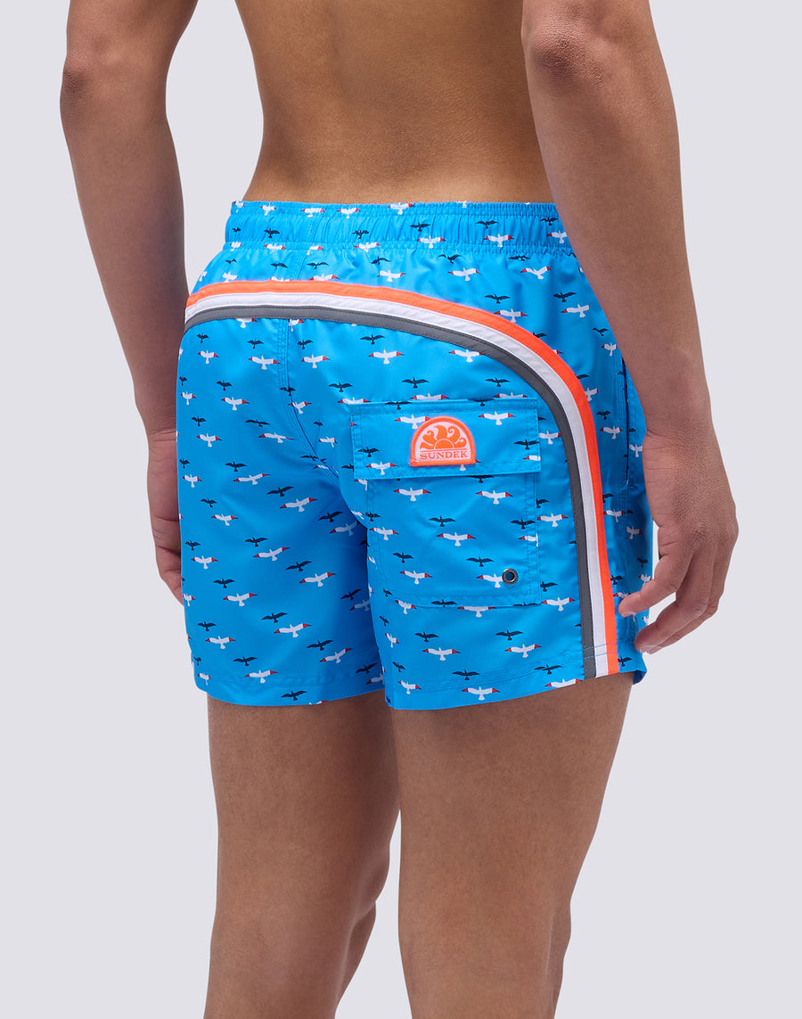 SHORT SWIMSUIT WITH ELASTIC WAIST IN RECYCLED POLYESTER WITH SEAGULL PRINT