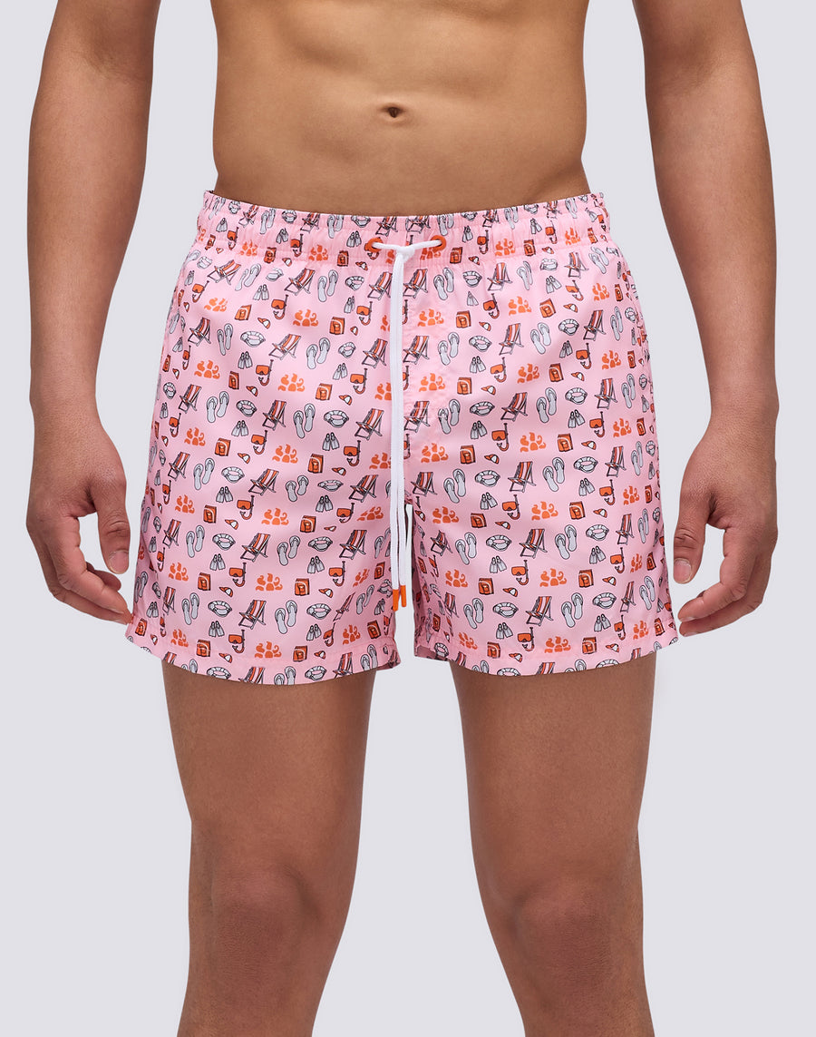 Swimshorts with elasticated drawstring waist, made from lightweight Repreve® fabric recycled from plastic bottles. Mini print featuring beach essentials and traditional Sundek rainbow in a tone-on-tone colour on the back. Outer thigh width 14"/35 cm (size M).