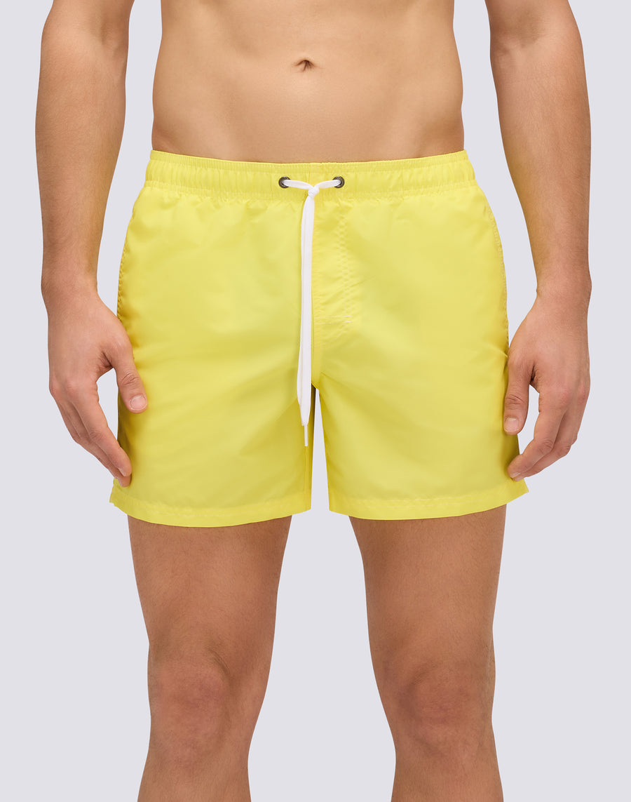 The M504BDTA100 men's short swimsuit embodies the essence of Sundek style: the perfect balance between iconic design, absolute comfort and quality. These elasticated waist beach shorts are the ideal companion for those seeking freedom of movement, quick drying and unmistakable style. Made from 100% nylon taffeta, the fabric that has made Sundek famous since 1958, these swim shorts offer a silky texture, exceptional lightness and extraordinary durability. Ultra-fast drying ensures immediate comfort, both in the waves and out of the water, allowing you to transition effortlessly from the beach to aperitif time. Featuring the unmistakable Sundek rainbow on the back, a symbol of the brand's authenticity and heritage, these swim shorts have an elasticated waist with an adjustable drawstring for a customised fit. The three-needle stitching ensures maximum strength and durability, even after countless sessions of surfing, swimming and sunbathing. Versatile and high-performance, perfect for surfing, swimming, beach volleyball and leisure, these men's swim shorts combine technical performance and casual style. The 35 cm length (in size M) offers a modern and sporty fit, ideal for those who love freedom of movement.