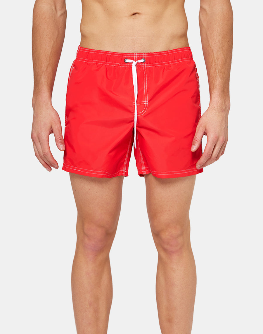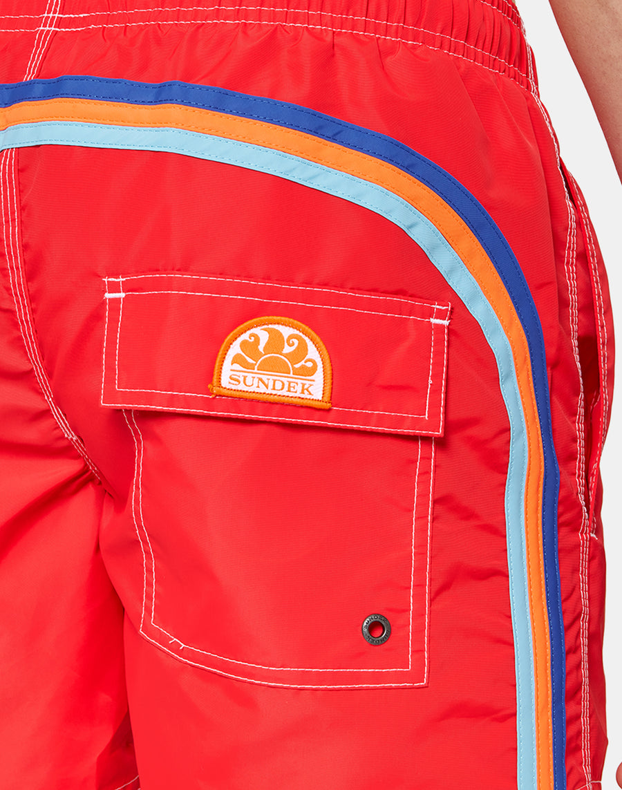 Short men's swim shorts with an elasticized waist, drawstring and iconic Sundek rainbow on the back. This swimsuit is made with three-needle stitching and 100 percent with our historic fabric, nylon-taffeta: silky smooth, lightweight and resistant to everything, it dries super fast to give you comfort anywhere, in the waves and out of the water.