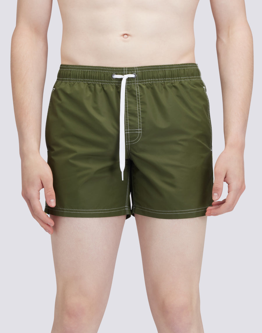 Short men's swim shorts with elasticated waist, drawstring and iconic Sundek rainbow on the back. This swimsuit is made with three-needle stitching and 100% of our historic fabric, nylon-taffeta: smooth as silk, light and resistant to everything, it dries very quickly to give you comfort everywhere, in the waves and outside waterfall. Length 35 cm (size M), measured on the outside of the leg.