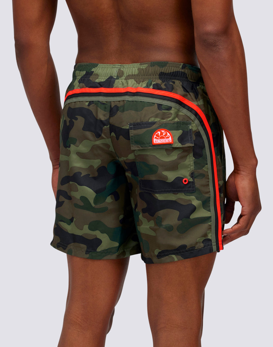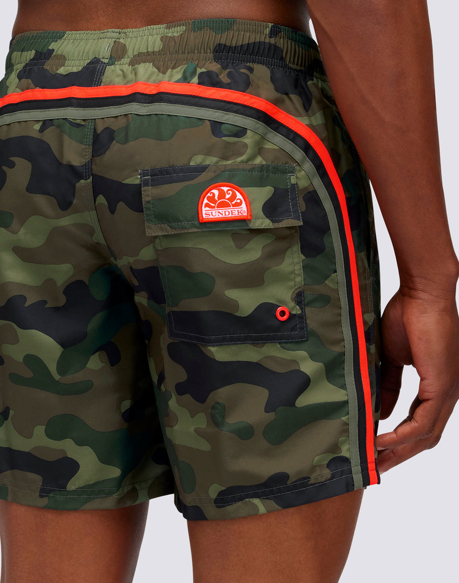 The camouflage print won't let your stretch-waisted Sundek medium swimming costume go unnoticed, comfortable and perfect thanks to the three-needle stitching that makes it super durable. Made of basic micropeach polyester, it features a small pocket on the back and the iconic Sundek rainbow.