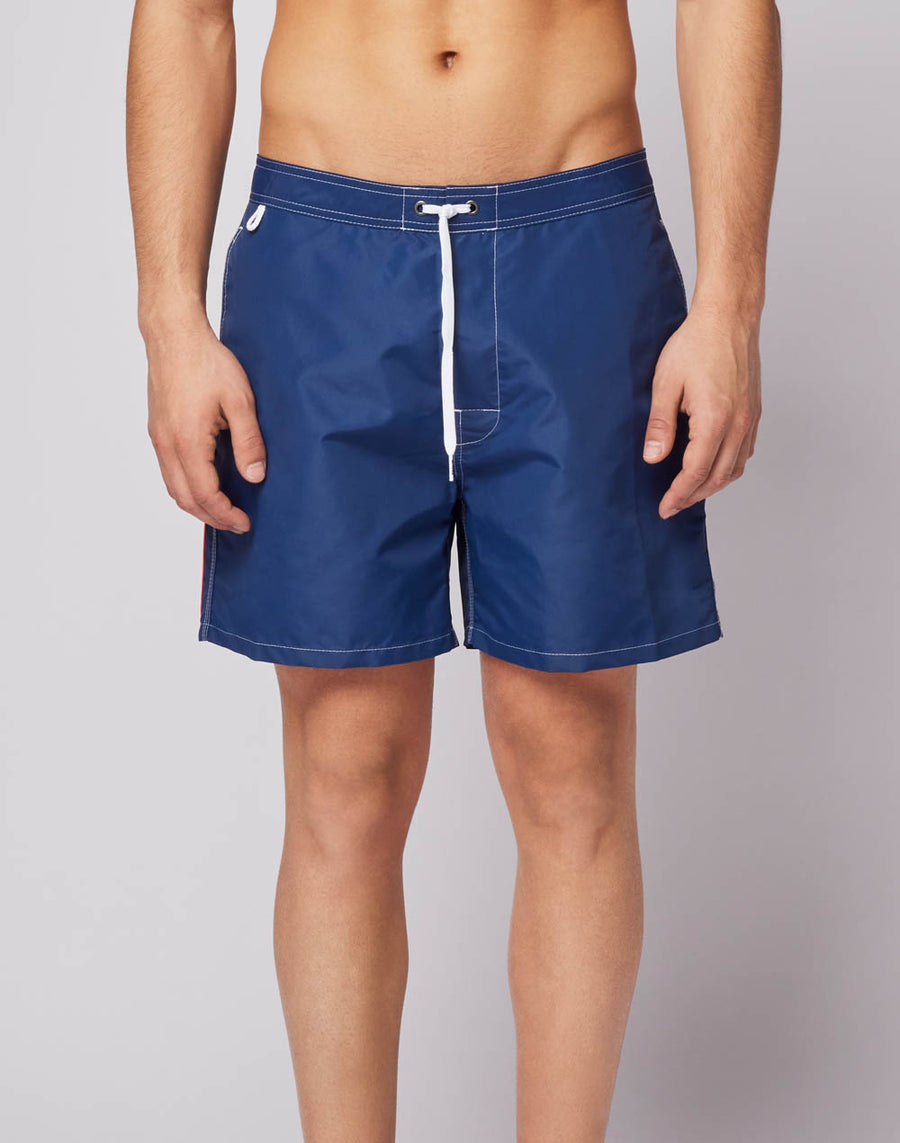 Iconic and timeless: this is the mid-length boardshort with a fixed waistband and drawstring closure, made in the historic nylon taffeta fabric that makes it lightweight, quick-drying and so durable that you'll pack it away year after year to give you new seasons of beach and sport. The classic three-needle stitching further increases the swimming costume's resistance and the back features the classic Sundek rainbow in three colours.