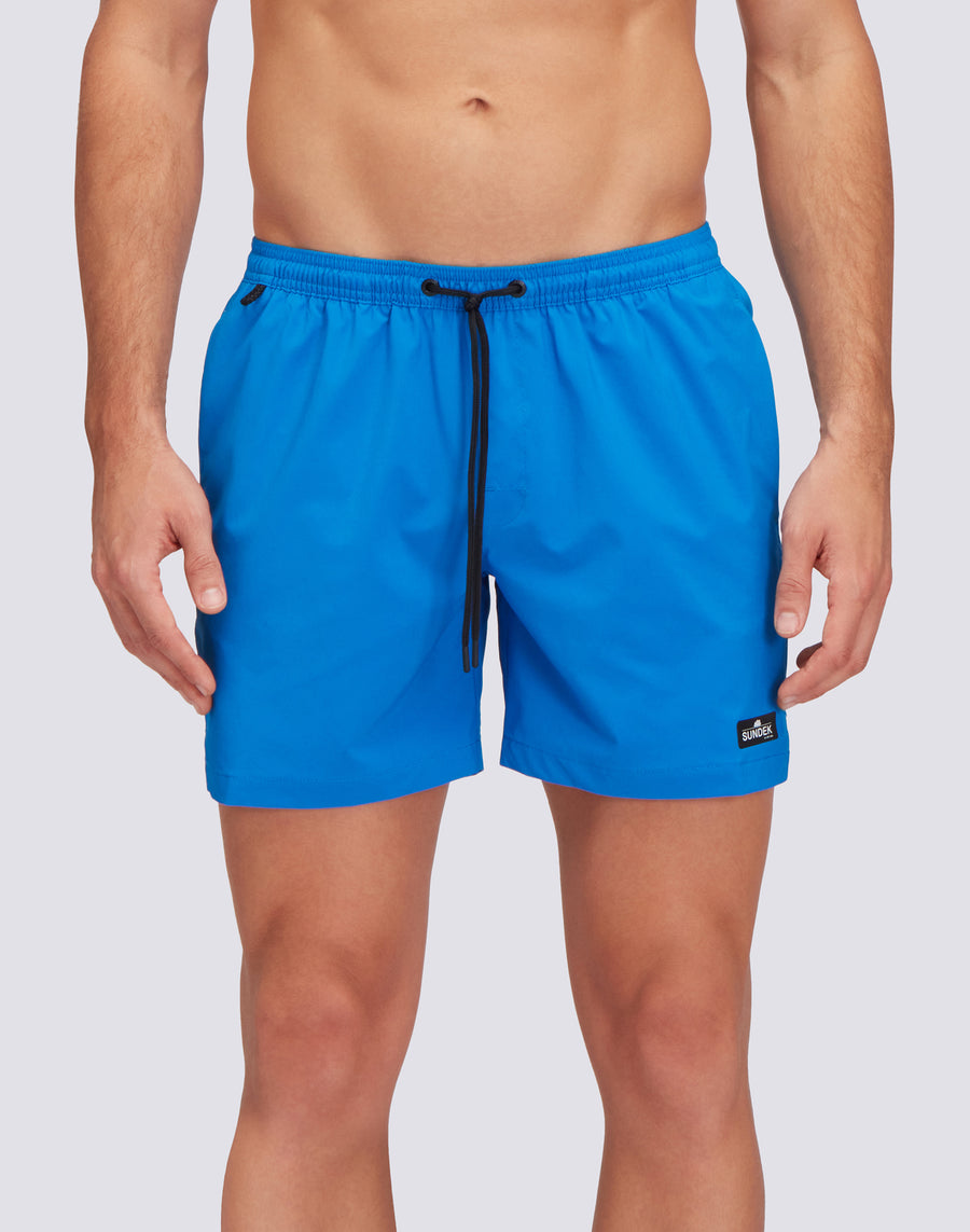 Follow the waves in this men's swimsuit with an elastic waist in a solid color with bright colors. Lightweight, durable, it dries very quickly and is made of 4 Way Stretch fabric. It features a practical removable waterproof pouch, attached to the waist like a key ring; ideal for keeping your phone with you, without having to use pockets or other external bags. It also has the classic Sundek three-needle stitching that increases resistance over time and our iconic rainbow on the back.