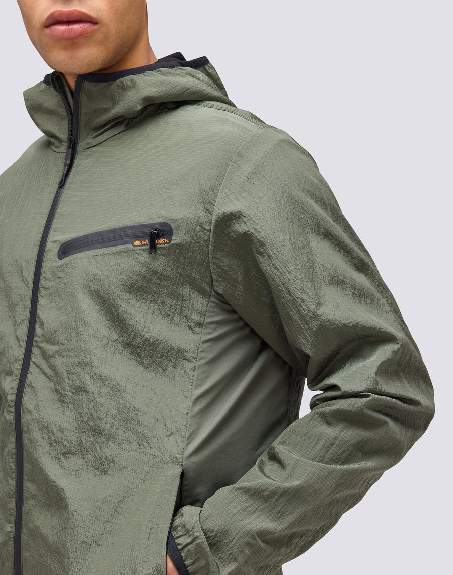 Men's utility jacket with a hood in super-light Ri-stop fabric with a crinkle look. Water-resistant treatment. Rich in technical details. Comfort and freedom of movement guaranteed. Regular fit.
