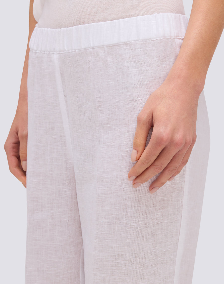 Women's long linen trousers with elasticated waistband are pure comfort: natural, breathable fabric, a waistband that doesn't pinch, a relaxed fit. For those seeking uncompromising casual practicality from day to night.