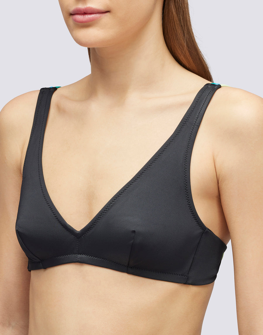 This bikini combines comfort and style thanks to its soft shape and rainbow details on the straps and bottom. Perfect for a fresh and colorful look, enjoy the sea or the pool in total relaxation.