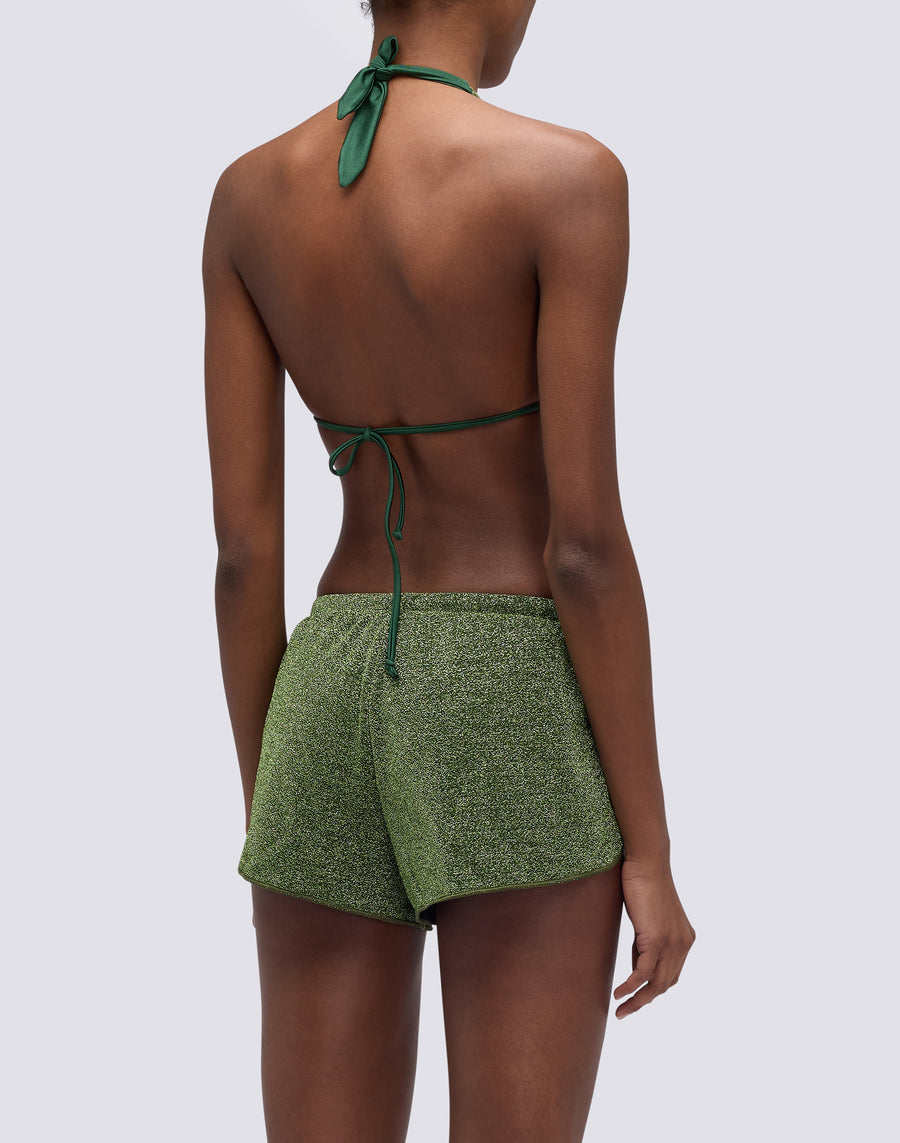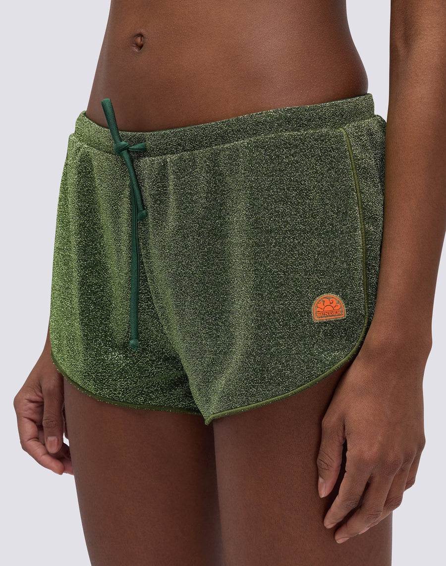 Short and light women's beach shorts in lurex, easy to combine with your favourite swimwear to make every beach day perfect.