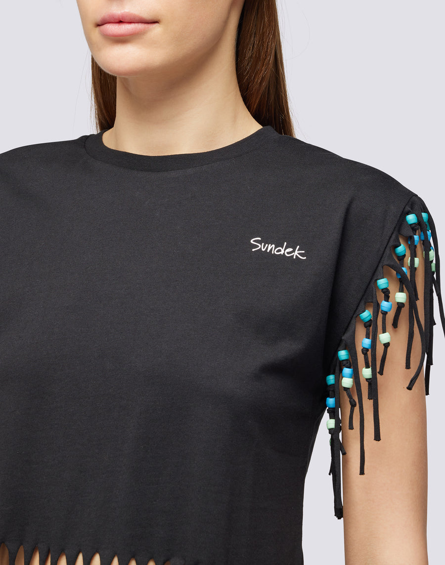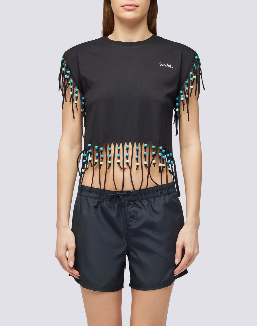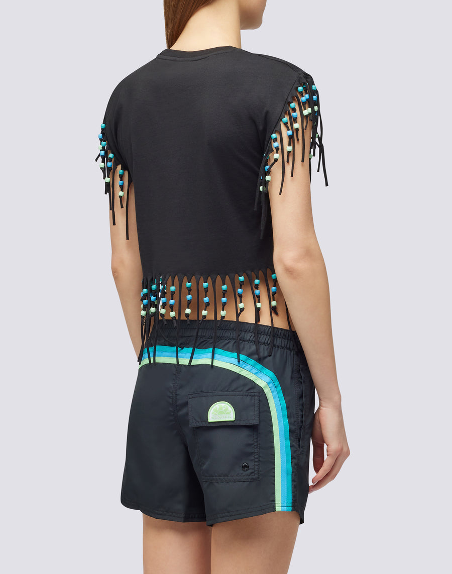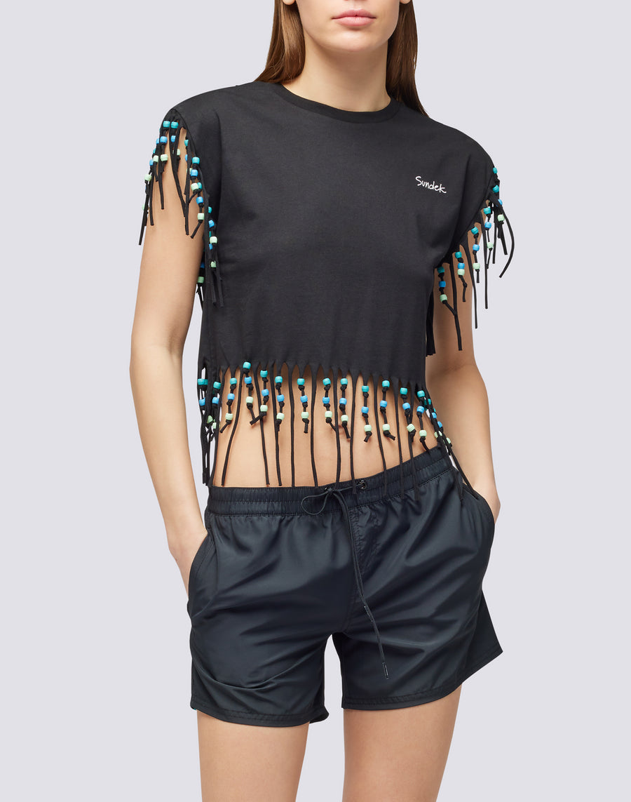 Perfect for those who love a super informal beach look, this women's fringed tank top is the ideal garment for summer days. Versatile and trendy, it is ideal when combined over a bikini.