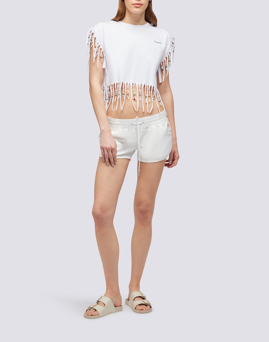 Perfect for those who love a super informal beach look, this women's fringed tank top is the ideal garment for summer days. Versatile and trendy, it is ideal when combined over a bikini.