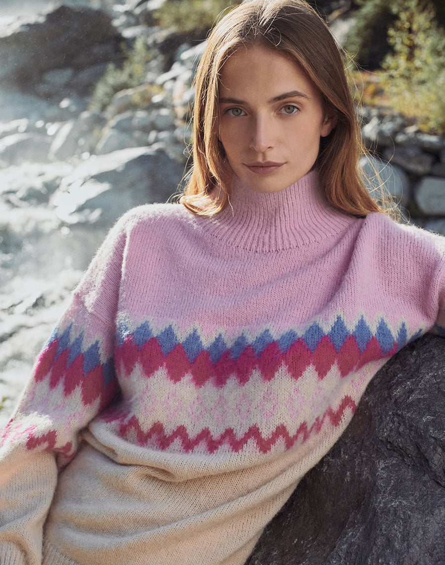 Norwegian-style maxi sweater in jacquard gauzed mohair, soft-handed, regular fit; fits a variety of looks to compose ever-changing outfits.
