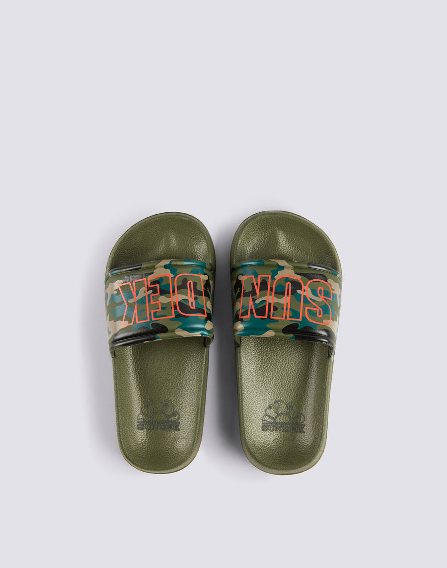 Para destacar incluso jugando en la playa o en la piscina. Estas mini chanclas son realmente originales, gracias al estampado de camuflaje acuático y al logotipo de Sundek impreso en la goma. La altura de la suela es de 2,5 cm; el ajuste es supercómodo.