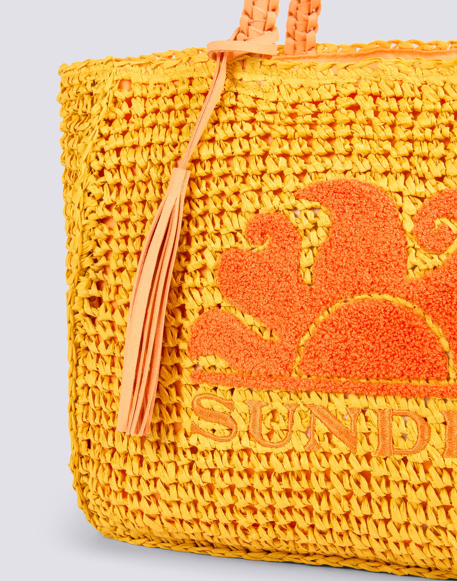 Bolso shopping de papel paja con logotipo de rizo y bordado en la parte delantera. Un bolso shopping de diseño esencial, pero lleno de detalles, con el que no pasarás desapercibida.