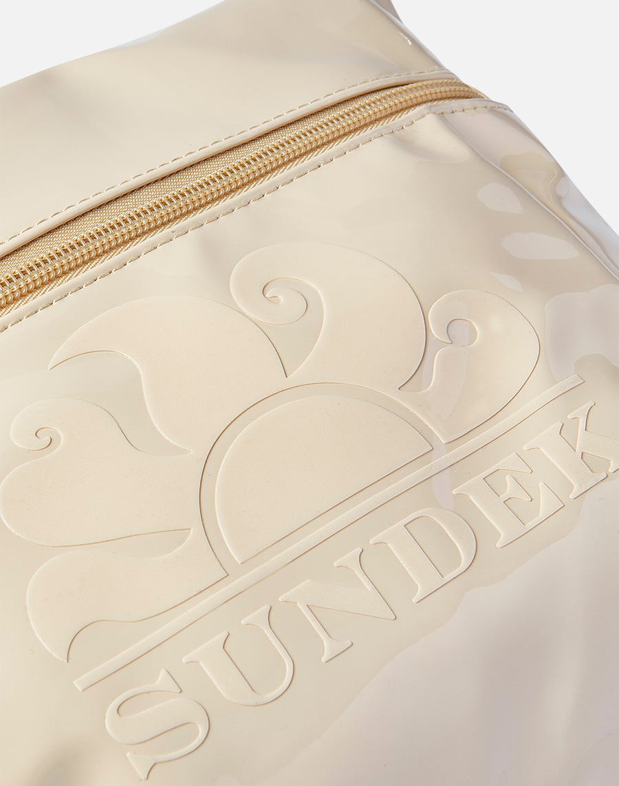 Bolso de playa impermeable con mosquetón y correa de mano, para llevarlo contigo cómo y dónde quieras. Un pochette versátil que puedes usar solo con el lazo de la correa o asegurarlo a bolsos y mochilas gracias al práctico mosquetón. El efecto brillante y las costuras delanteras le dan al bolso de mano un toque de carácter esencial. También es resistente al agua, para proteger tus artículos más importantes.