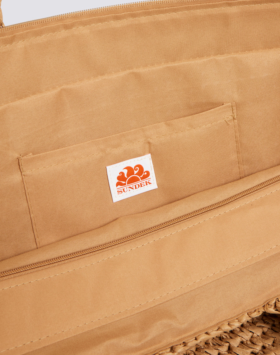 Maxi bolso de paja de papel tejido con cierre central de cremallera y asa. De gran capacidad y diseño original.