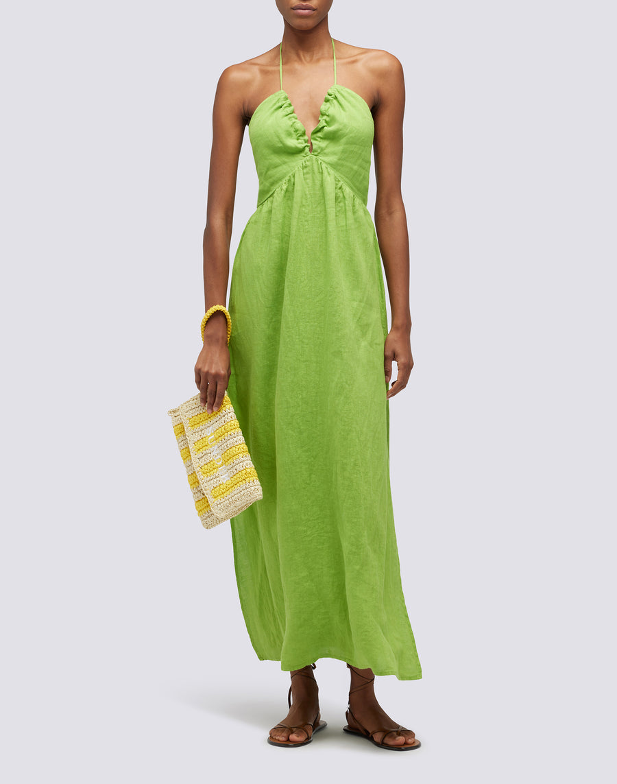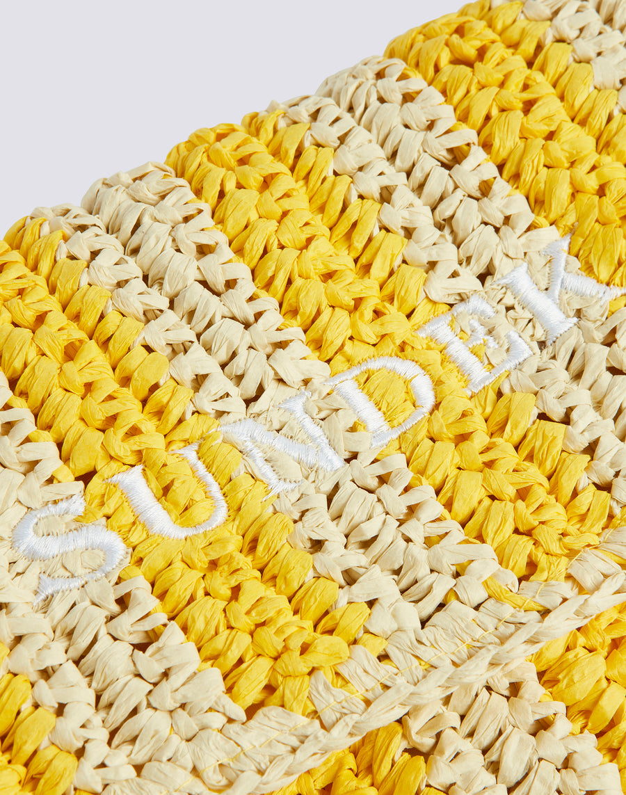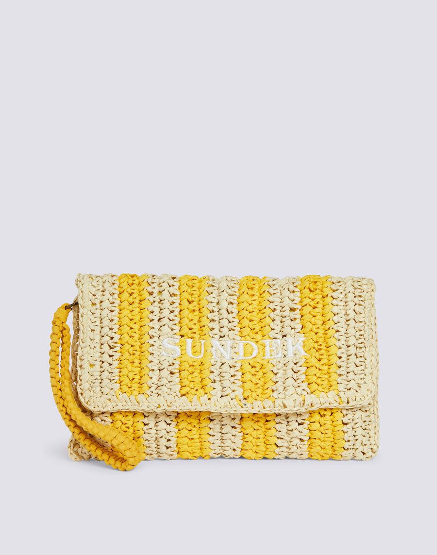Bolso de mano Izumi de papel efecto paja con estampado de rayas. Equipado con un asa de mano, es cómodo de llevar gracias a su pequeño tamaño. El estampado de rayas lo hace alegre y original.