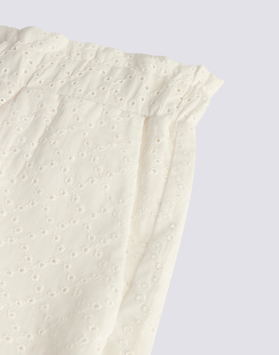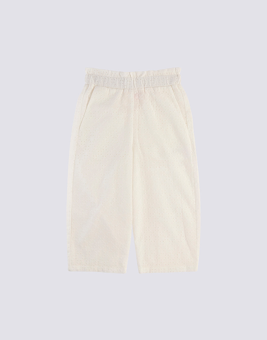 Pantalón refinado de niña en algodón sangallo con cintura elástica. Para ocasiones elegantes, ideal con blusa o camiseta.