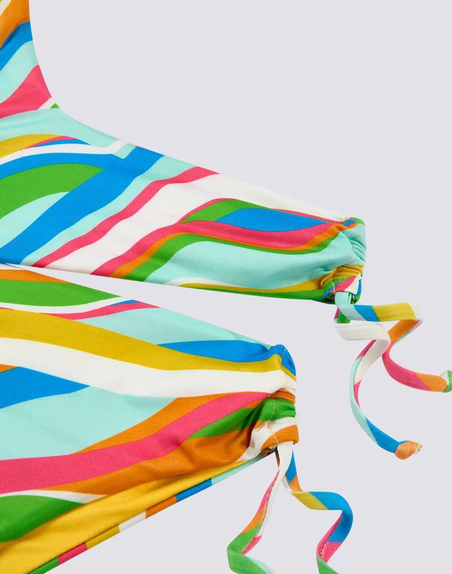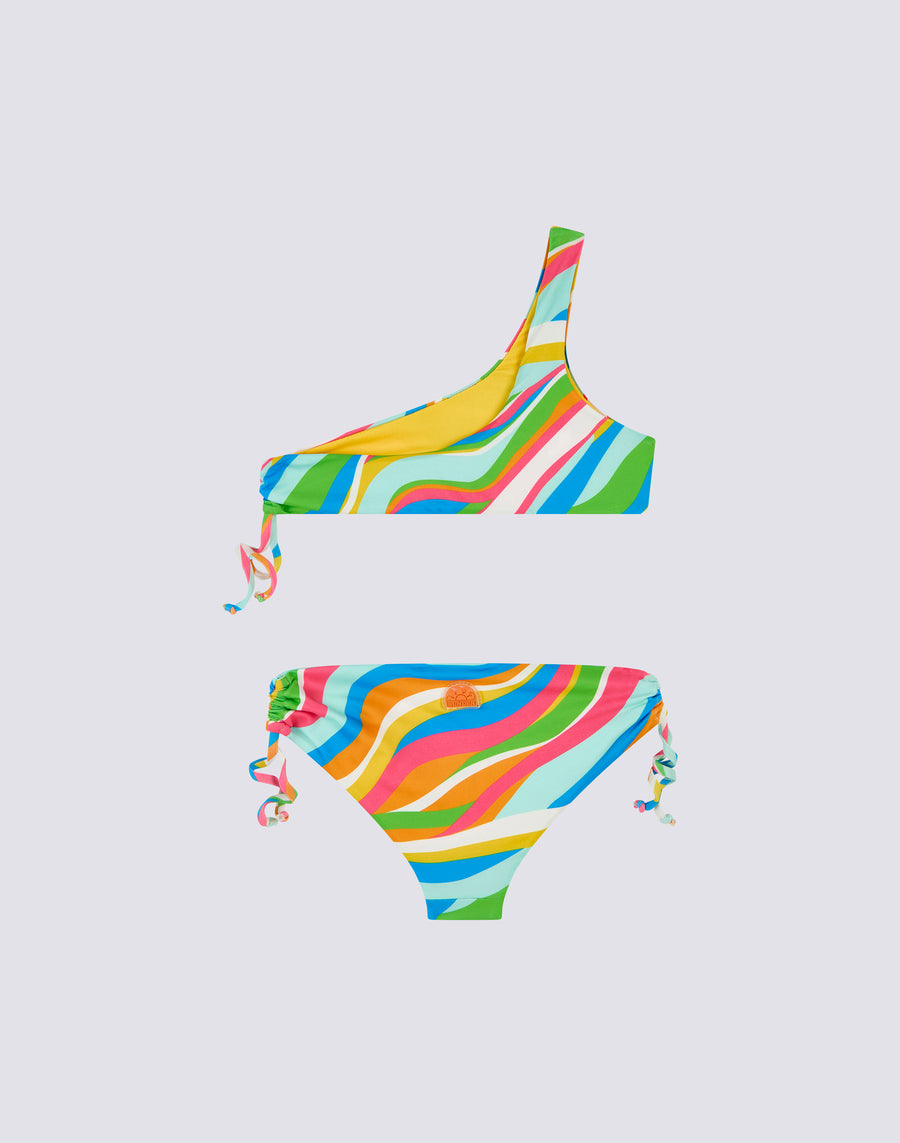 Bikini de niña con estampado multicolor, compuesto por un top de un solo tirante y una braguita fija con cordones laterales.