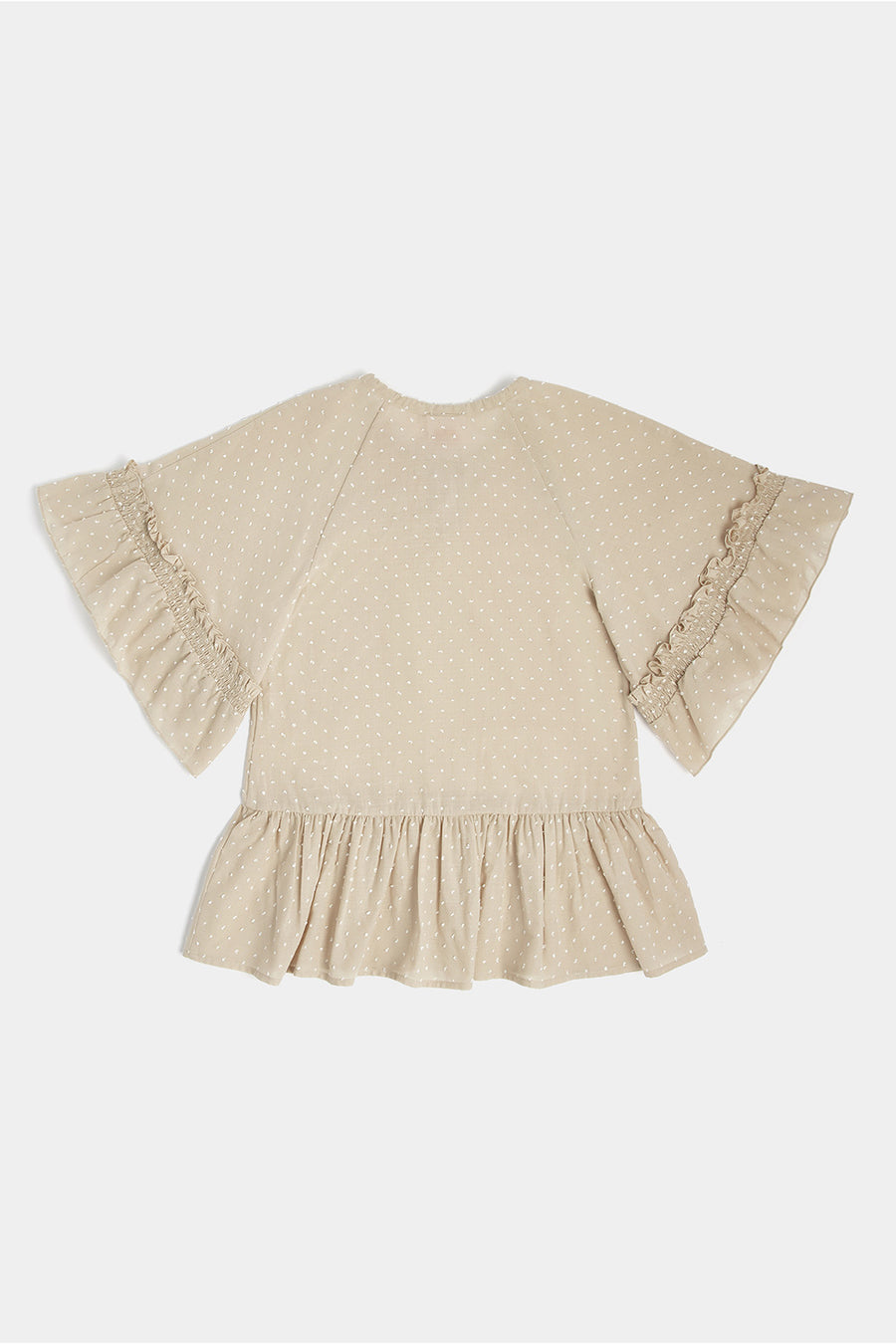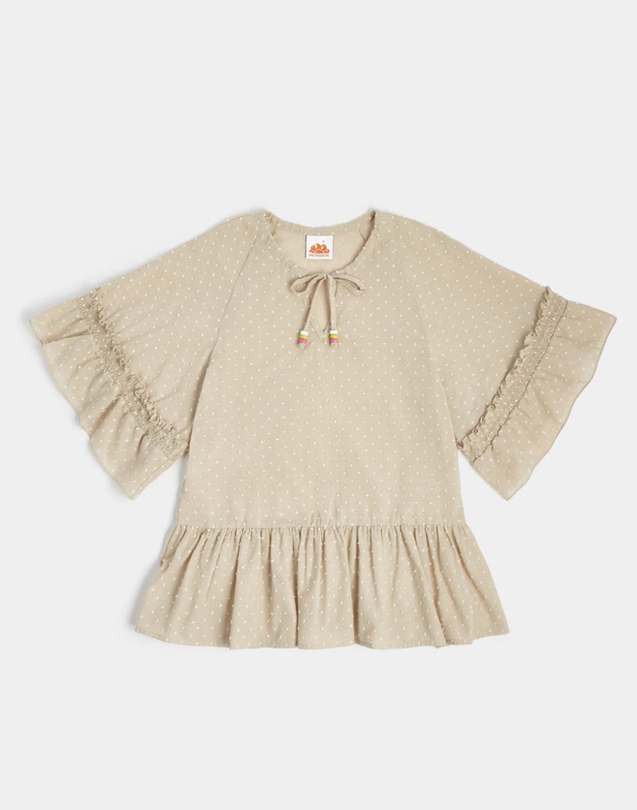 Camisa de manga ancha y corte amplio, con detalles de arcoíris en los cordones de pedrería. Fresca y ligera, para lucir en eventos y ocasiones.