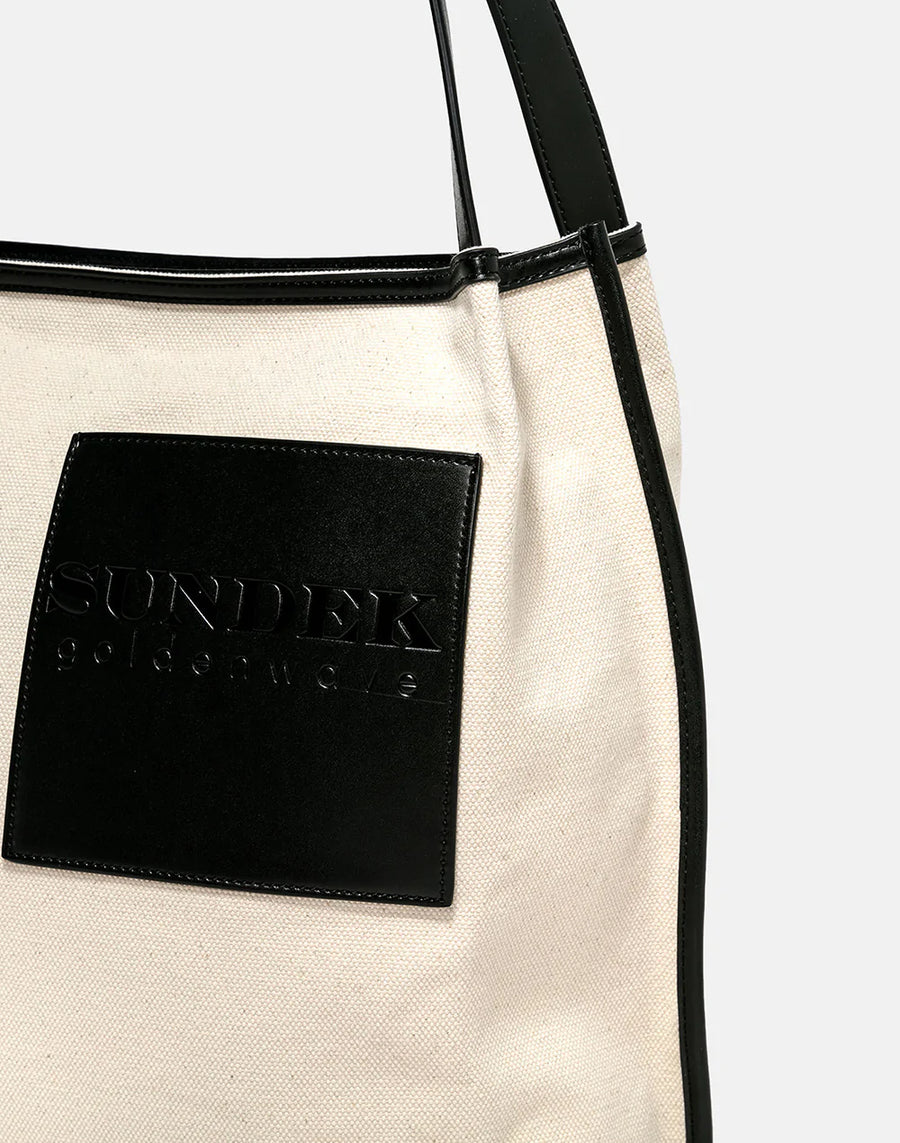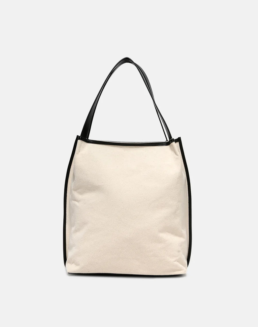 Amplio tote bag de lona de algodón con detalles de piel sintética en contraste. Doble asa de hombro cómoda. Bolsillo aplicado en contraste en la parte delantera con logotipo.