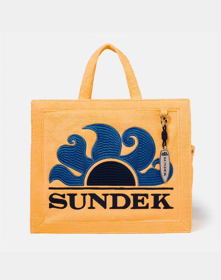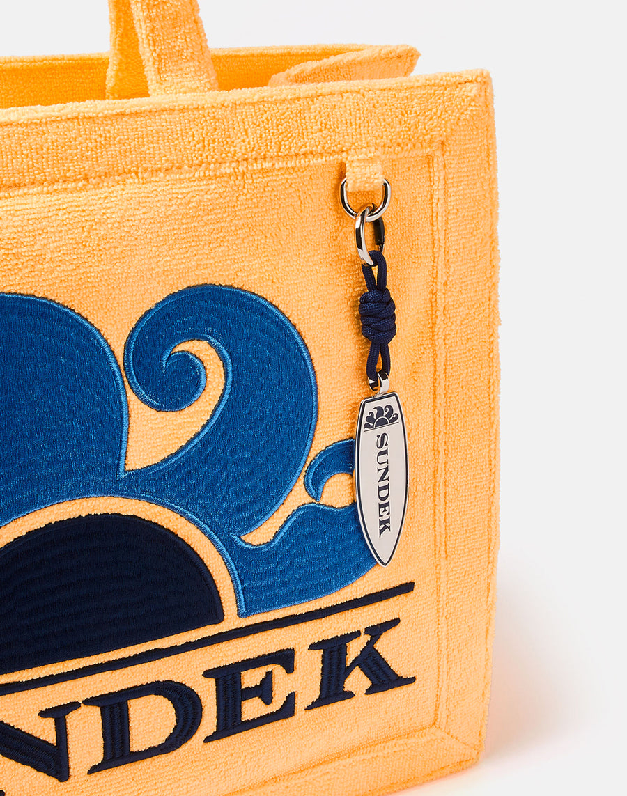 Bolsa de playa de mano de rizo con logotipo bordado. Charm con la forma característica de una tabla de surf