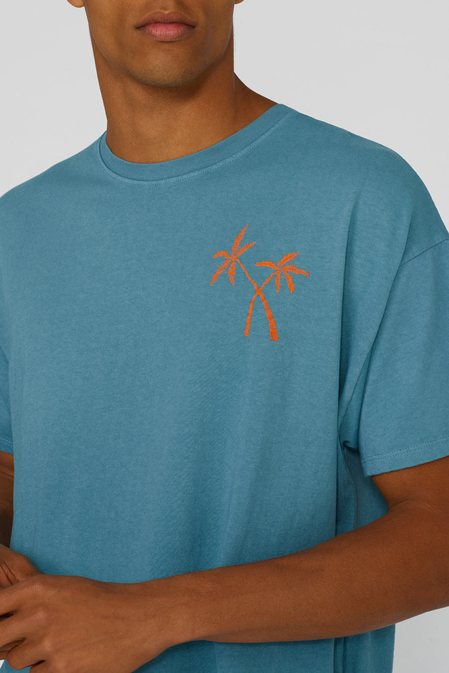 Un bordado en forma de palma para llevar el verano a todas partes, viajando o en su vida diaria. La camiseta masculina hecha de algodón de jersey suave tiene un ajuste cuadrado, pero amplia y abundante, perfecta para innumerables combinaciones.