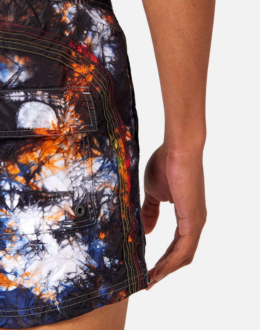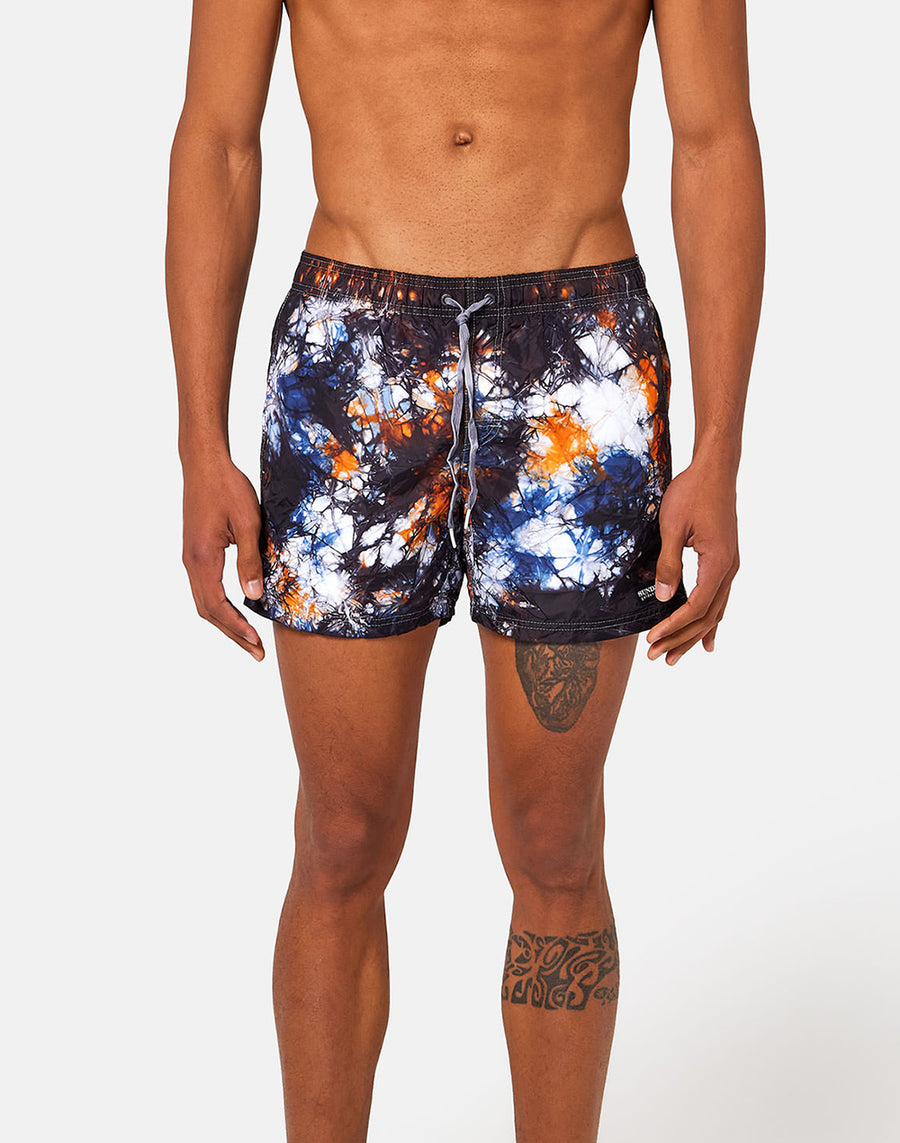 Boardshorts con motivo especial tie-dye, tratados y teñidos con técnicas artesanales. El tejido histórico y la confección del modelo lo hacen ultrarresistente temporada tras temporada.